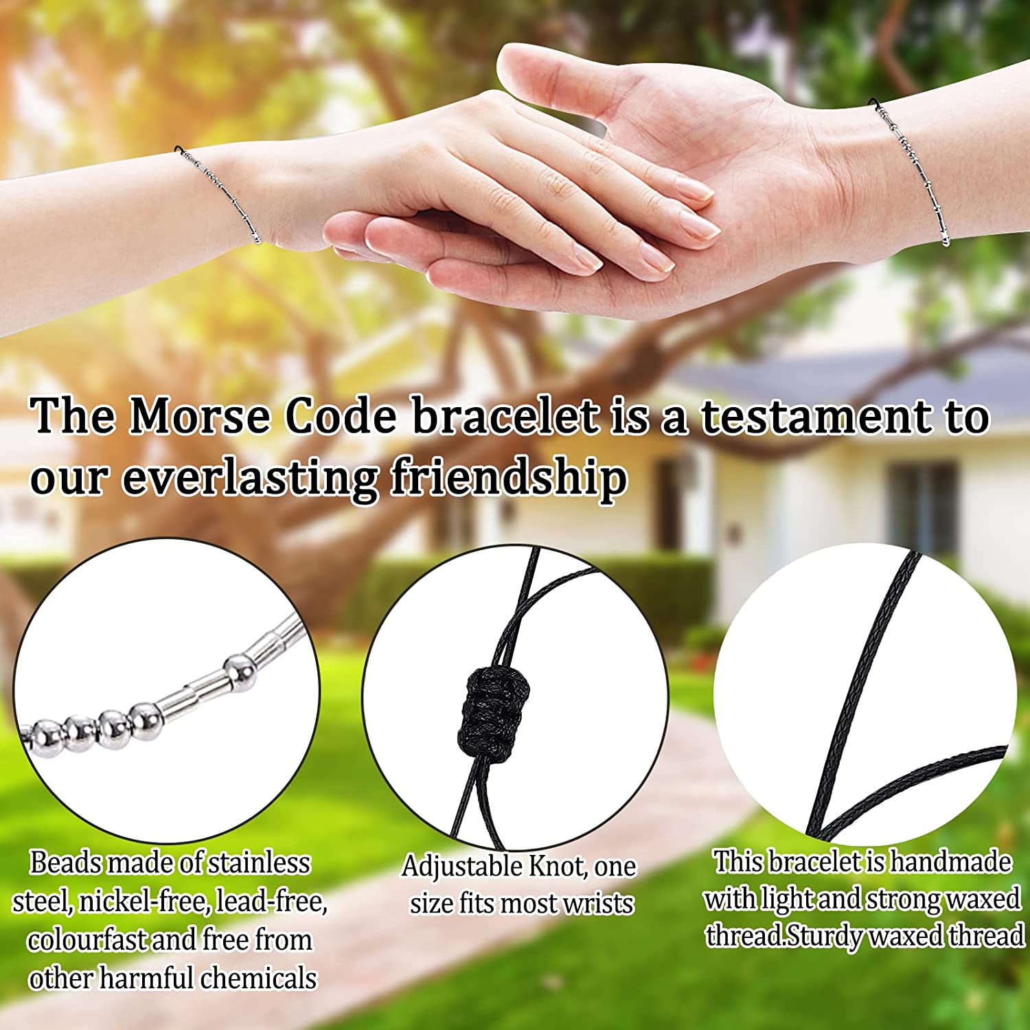 • ?MORSE CODE BRACELET MATERIAL?These friendship couples bracelets are made of durable wax cord. The beads of Morse code bracelet are made of stainless steel, which is nickel free, lead free, do not fade and no other harmful chemical composition.