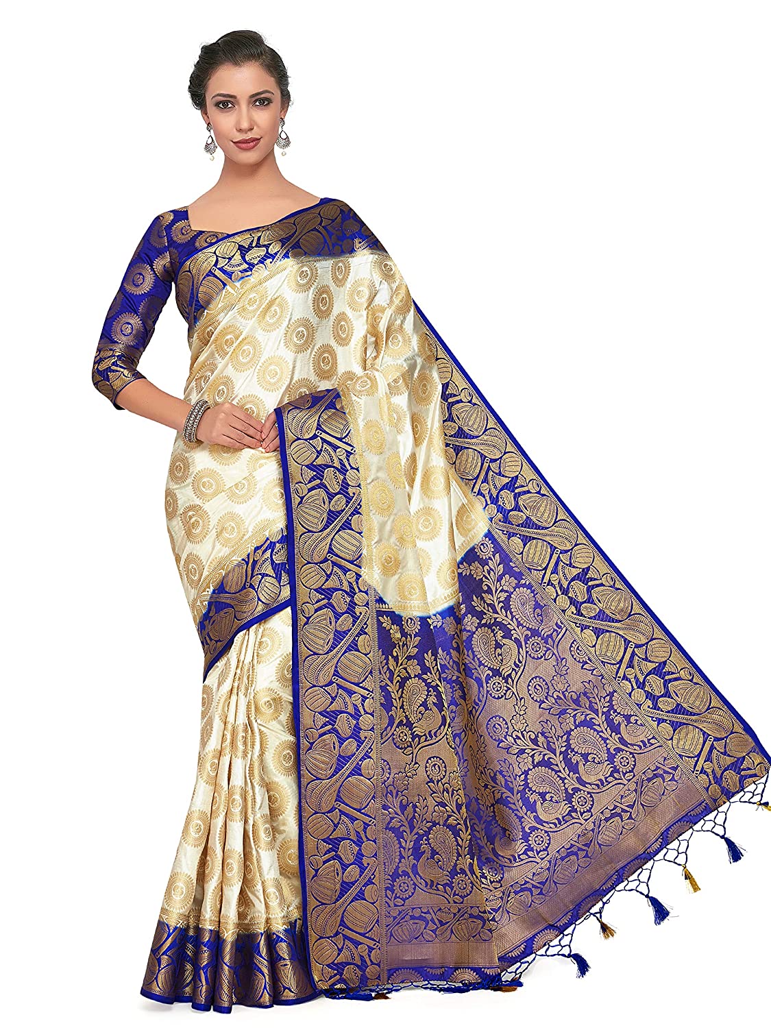 Colour: beige ii fabric: art silk ii length: 6.2 m including blouse / size: free size ii blouse colour: blue ii blouse type:contrast unstitched blouse (Attached At the Last of Saree, Length 5.40 m+.80 Cm)