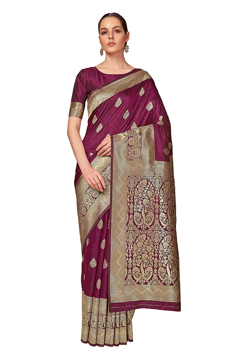 Banarasi Silk Blend And Zari Woven Saree With Embellished Unsttiched Blouse Piece (Monjolika 4804_ Wine)