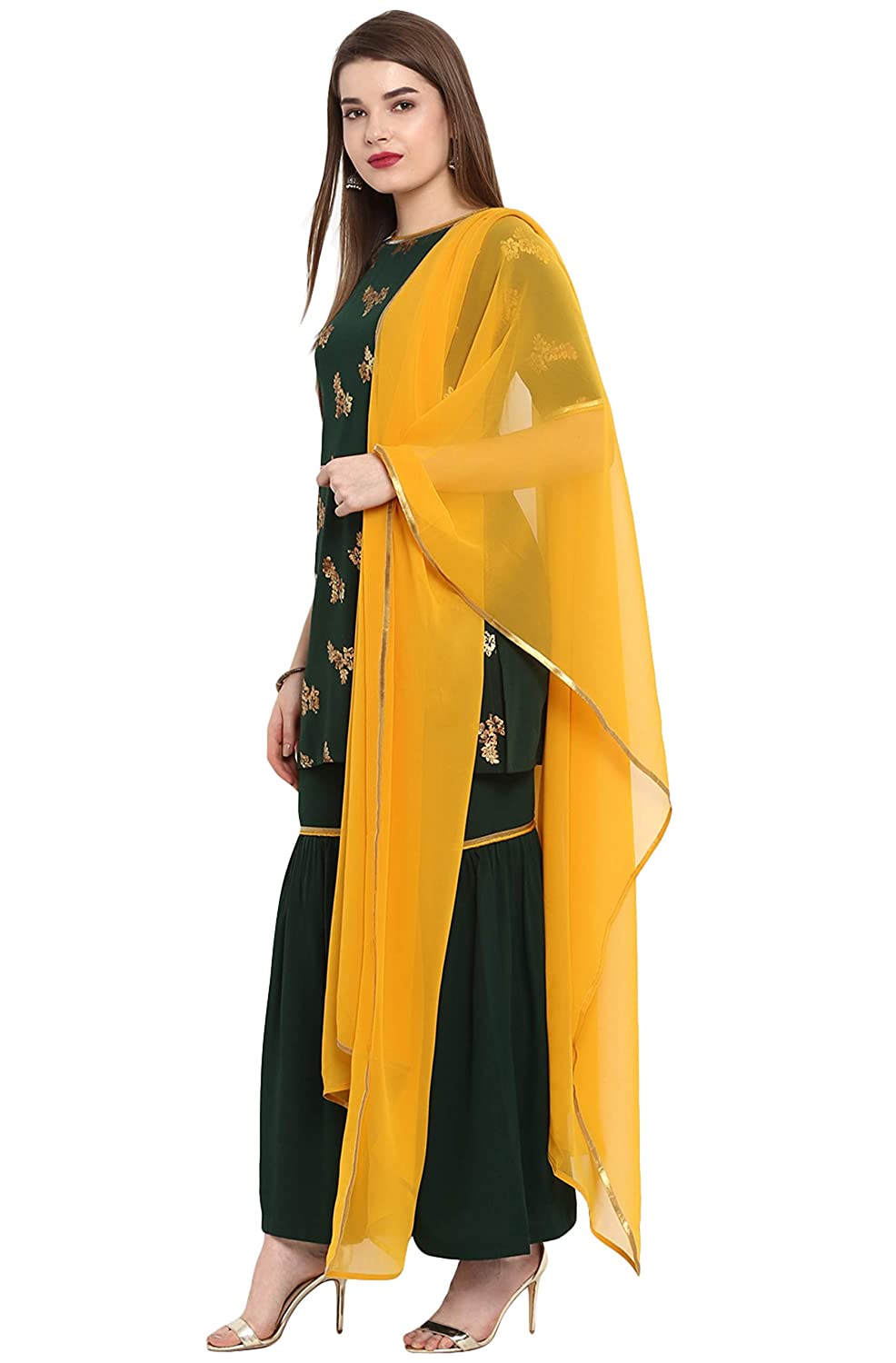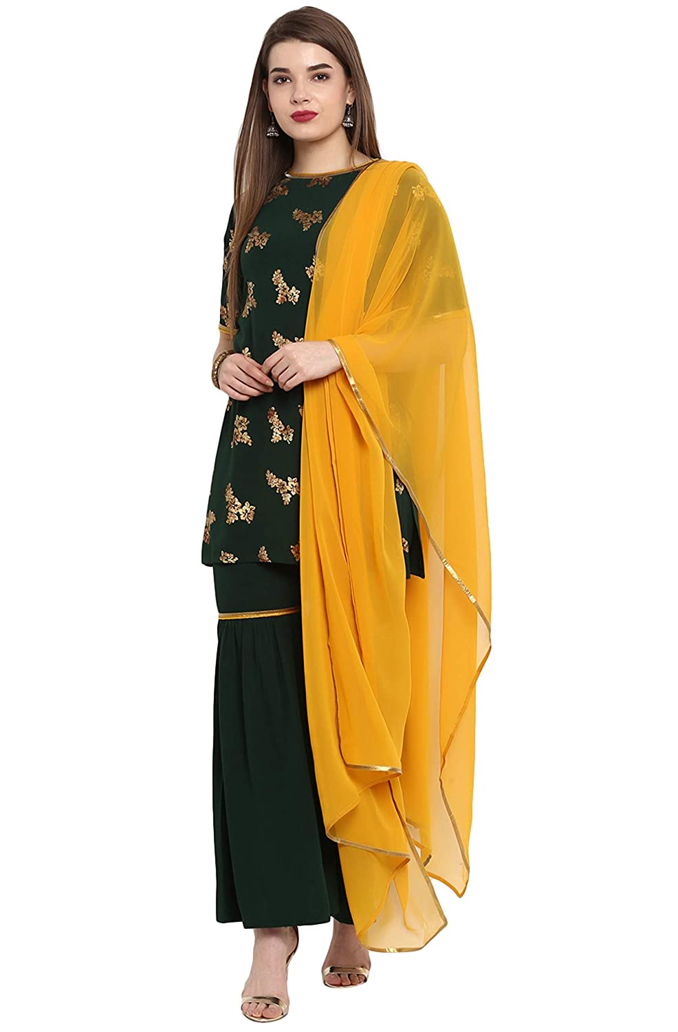 - Kurti Fabric: Poly Crepe, Sharara Fabric: Poly Crepe, Dupatta Fabric: Georgette (100% Polyester)