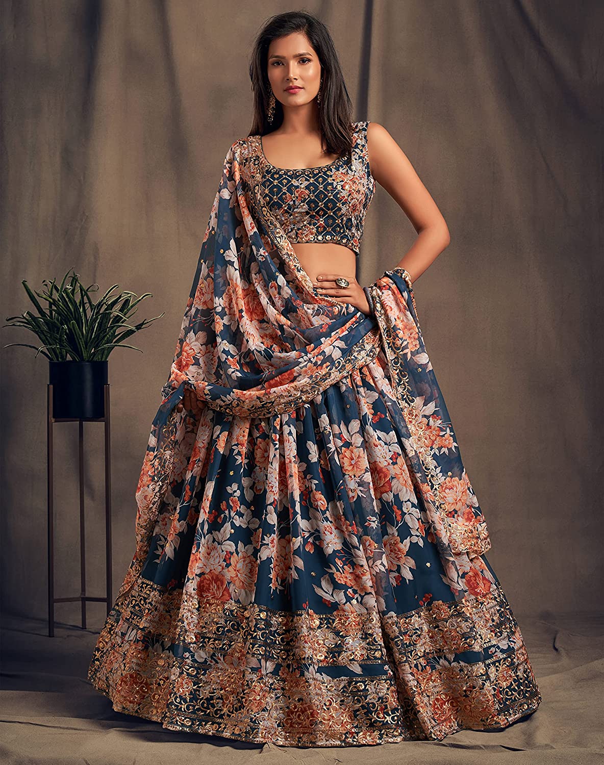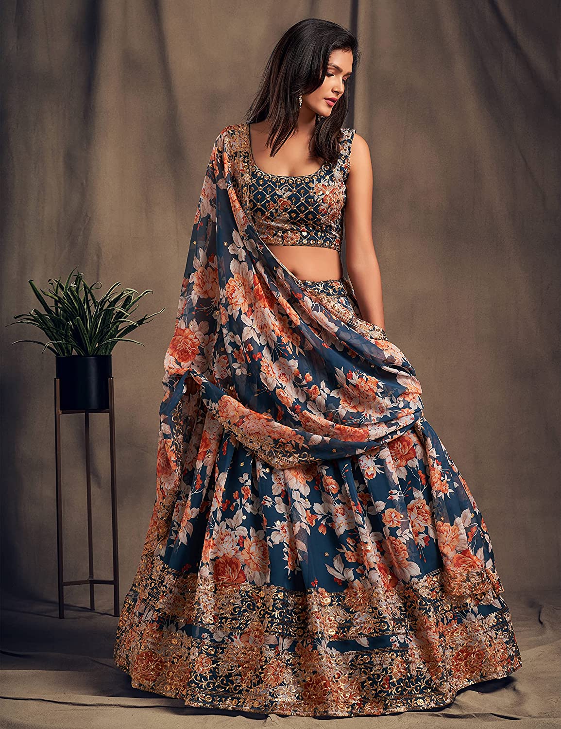 - Lehenga Work: Zari and Sequins Embroidery work with Digital Floral Print; Blouse Work: Zari and Sequins Embroidery work with Digital Floral Print; Dupatta Work: Zari and Sequins Embroidery work with Digital Floral Print