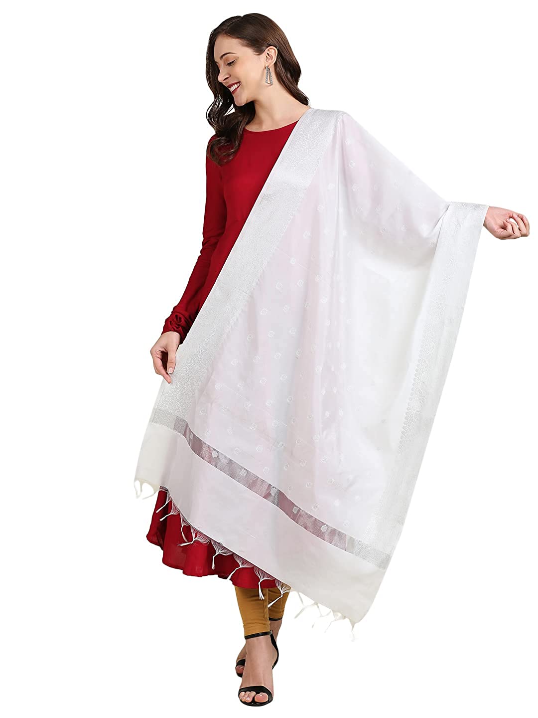 - This beautiful Banarasi dupatta is adorned with beautiful woven butties along with rich silver zari border.