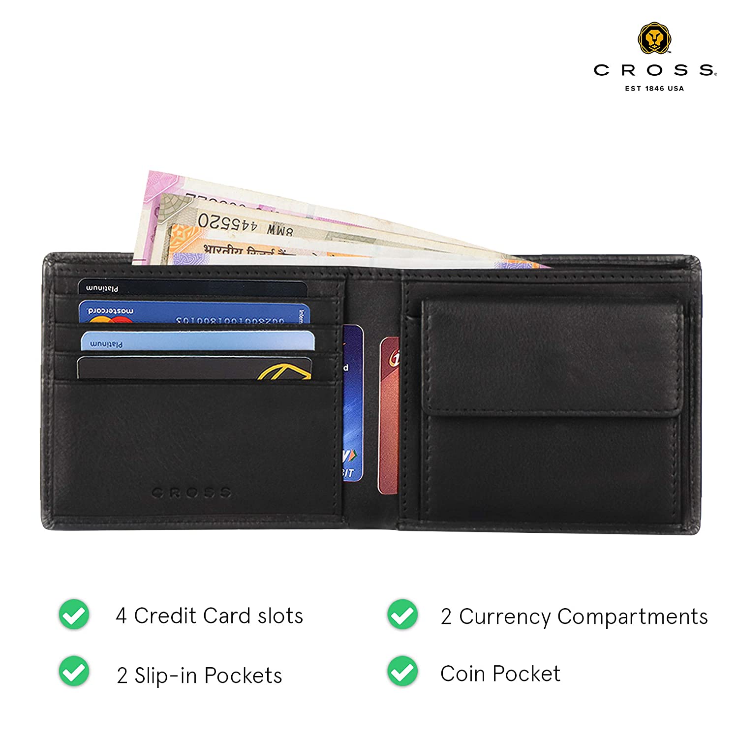 • WALLETS FEATURES: Authentic Cross Branded wallet made with 100% Genuine Leather. Includes 4 Credit Card Pockets, 2 Currency Compartment and 2 Multi-Purpose Slot With 1 Coin Pocket.