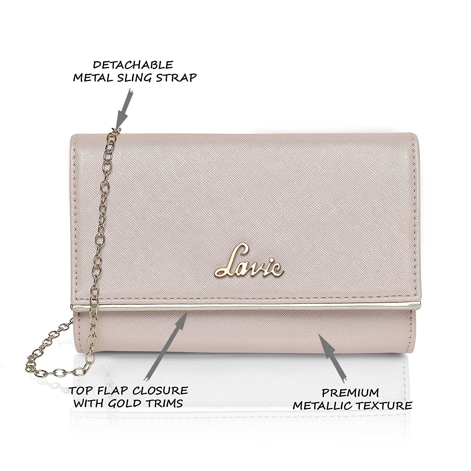 • All Lavie evening bag comes up with Lavie branded lining and clasp closure which can be opened and closed smoothly, built-in pockets,Long Shoulder detachable Metal Chain, large storage capacity which easily carries your basic essentials like a mobile phone, cards, cash, car keys, small wallet, mirror, lipstick and some makeups.