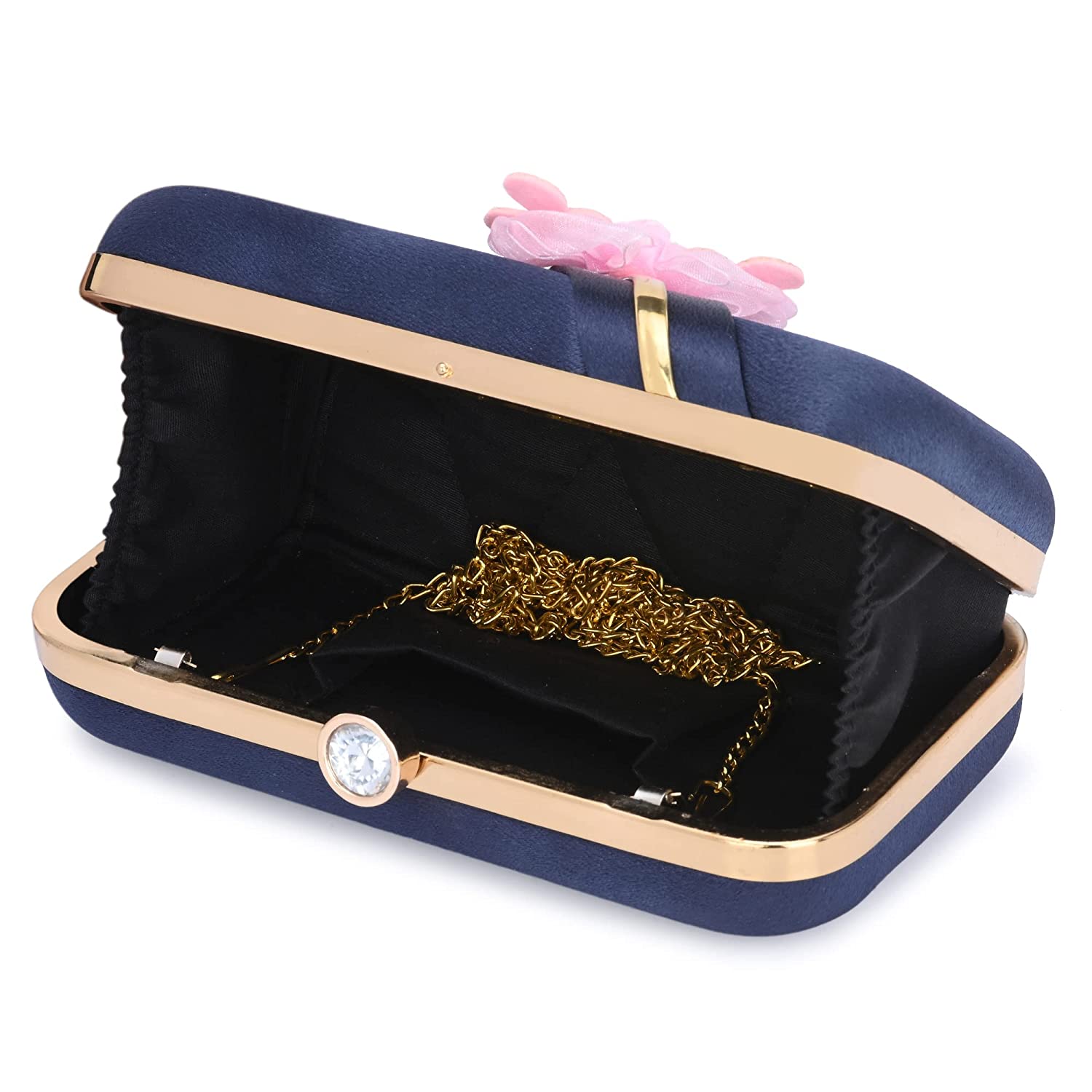 - This oval framed clutch is made of premium shiny material and It consists of an exclusively imported metal frame , silk lining and a crystal studded clasp.