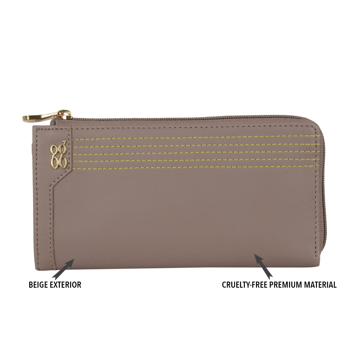 • Buff exterior with 1 main compartment I 3 total number of pocket I 6 creditcard pocket l 2 Coin pocket l Zipper closure I Cruelty-free premium material.