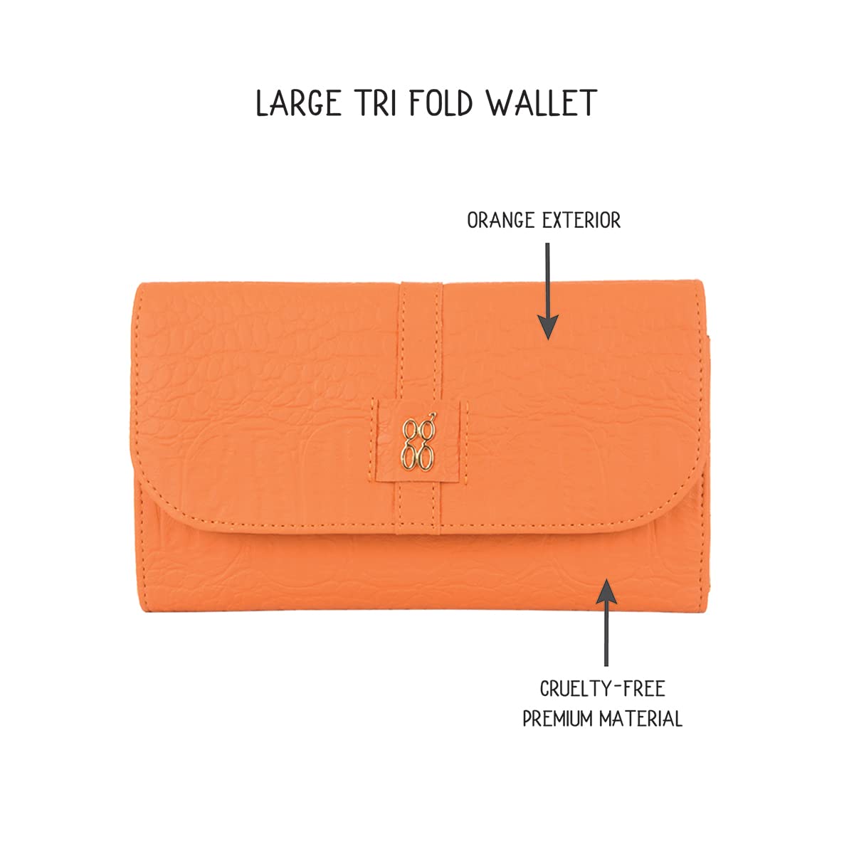 • Orange exterior with 1 main compartment I 2 total number of pocket I 12 creditcard pocket l 1 Coin pocket l Button closure I Cruelty-free premium material.