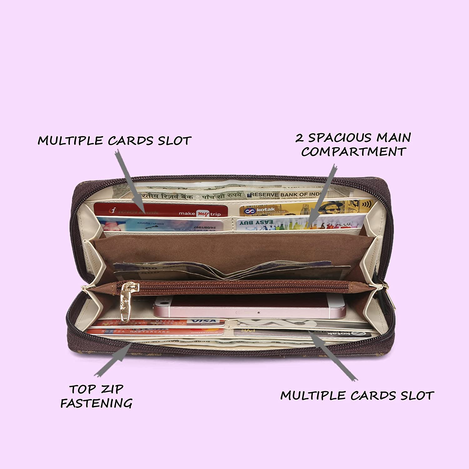 • This wallet has 12 card holders, 3 compartments, has a zip closure. Pocket can hold multiple cards, coins, change. Conveniently store your credit cards, ID card, bills, cell phone, so it's easy to carry all your important belongings and meet your daily needs.