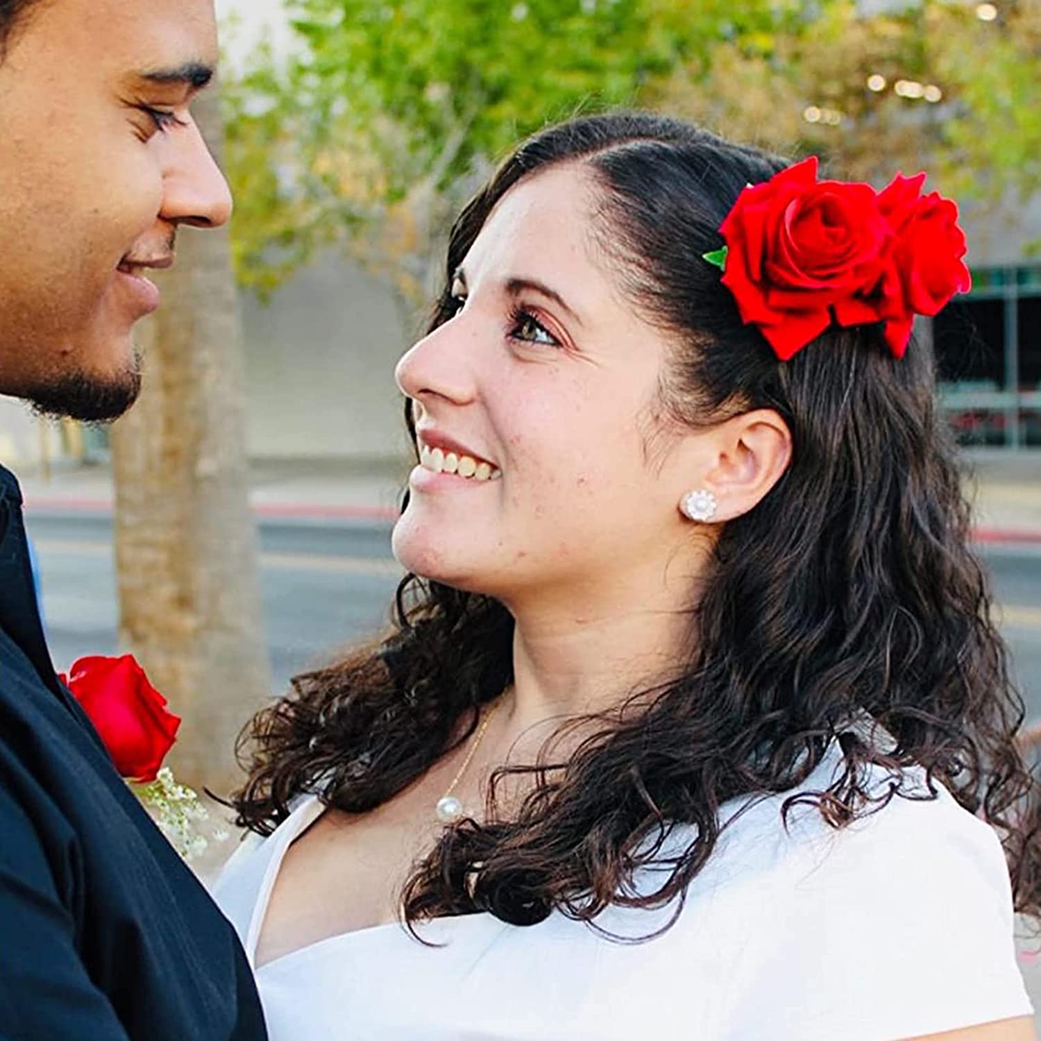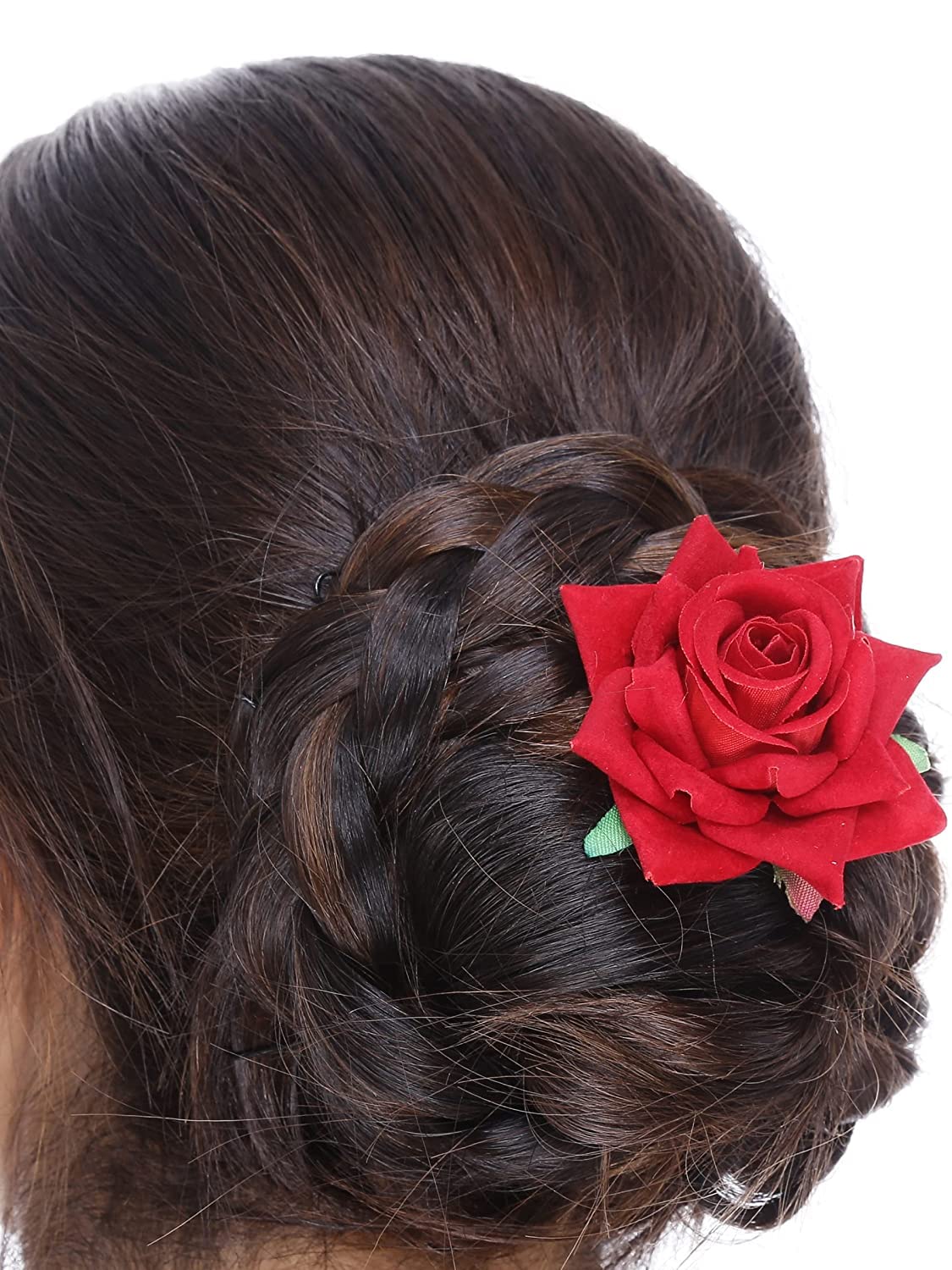 4pc Bridal Wedding Hair Clips RED & WHITE ROSE FLOWER BRIDE HAIRCLIPS Hair Pins Hair Clips Hair Accessories Bun Maker for Women and Girls