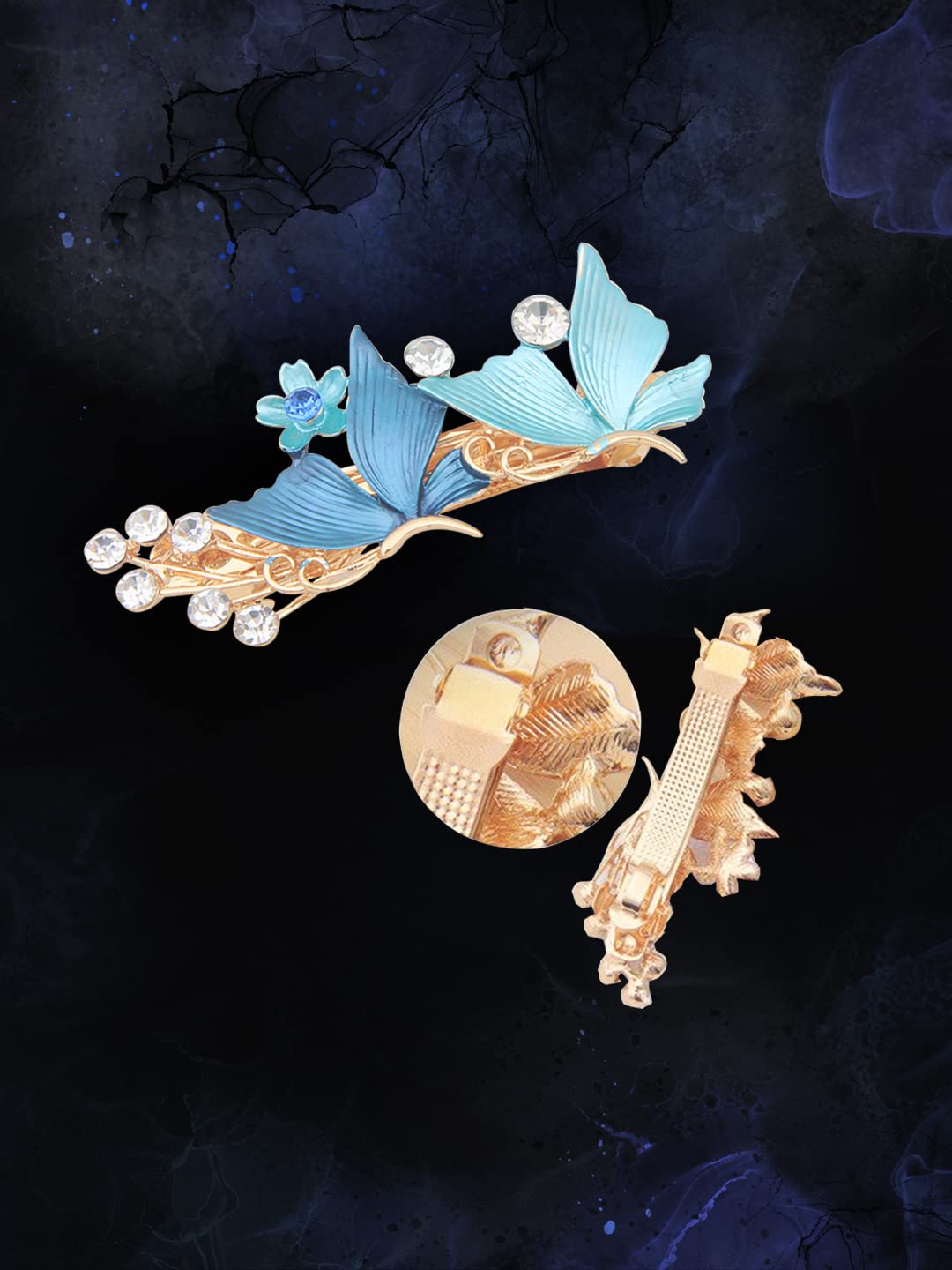 • Gold toned Butterfly clips for women french barrette hair clips for women in enameled Blue butterfly hair accessories for women stylish Wear. A must have piece in your fashion wardrobe. French barrette clips are classic, they never go out of style, and let you design your hairstyle in many ways you want.