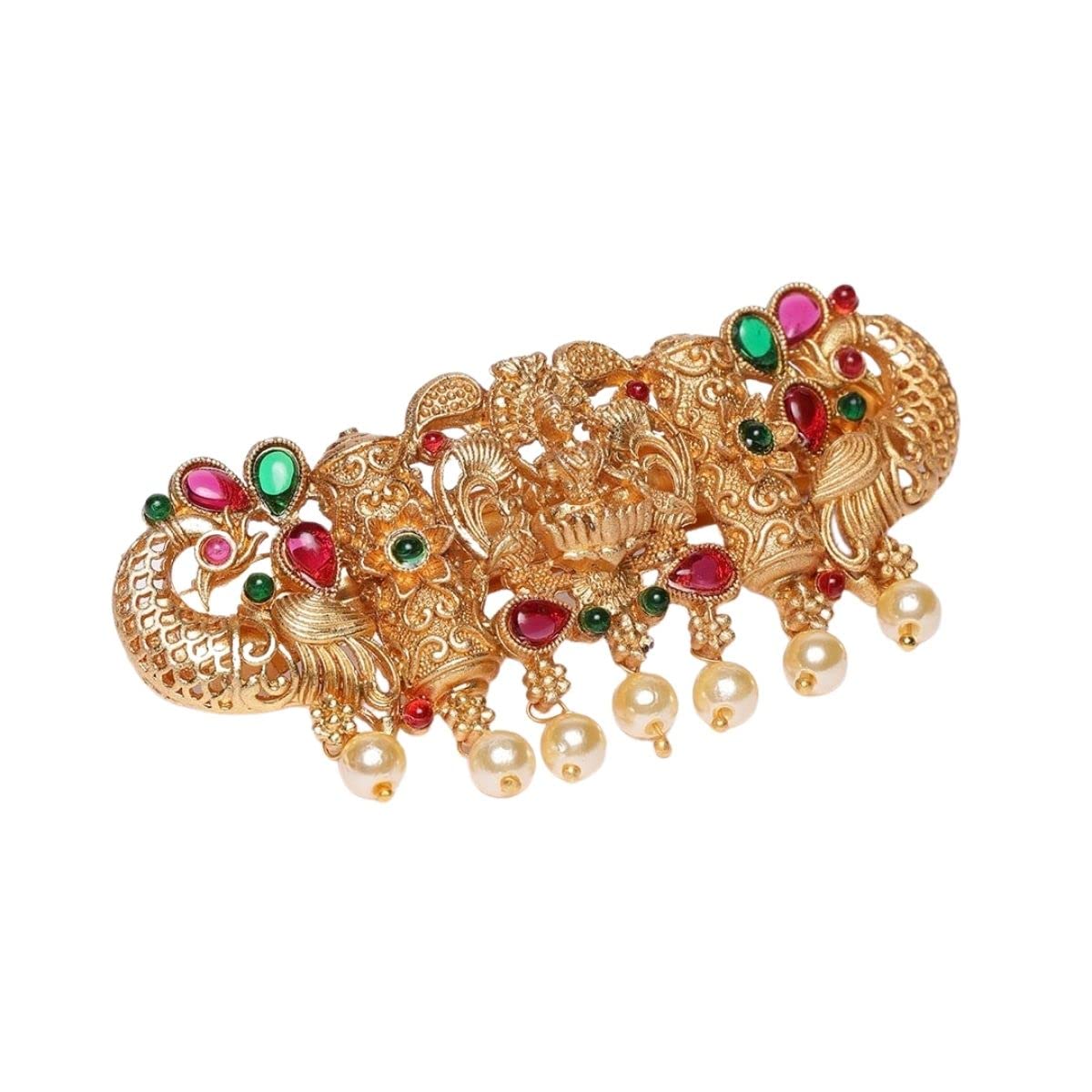 Ethnic Traditional Matte Gold Temple Laxmi Bridal Antique Jewellery | Hair Clip with Ruby Green Stones & Pearl Drops | French Barrette For Women and Girls (Pack Of 1)