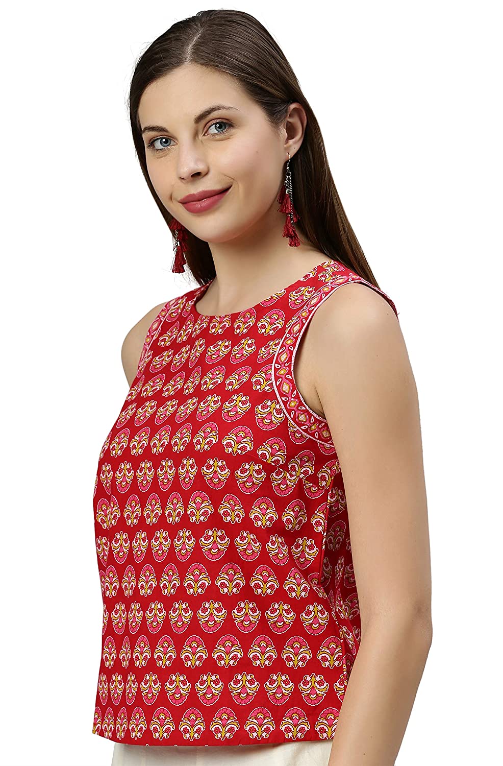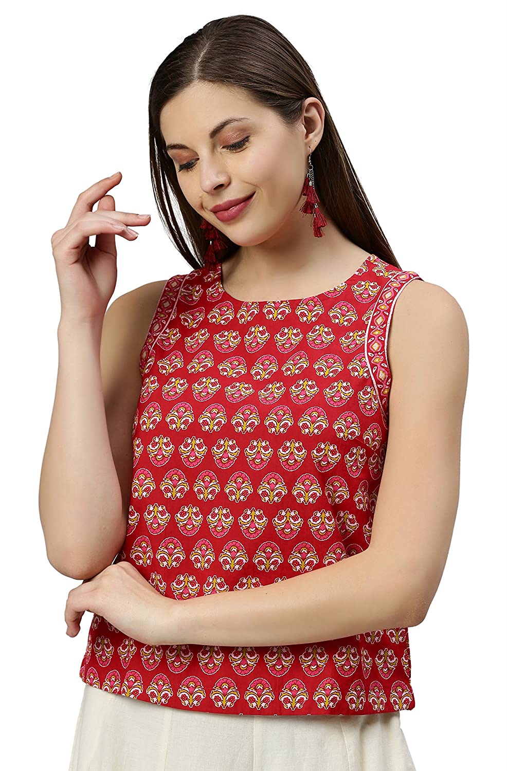 - Style:- Length: 22(inch) | Pattern: Floral Print | Occasion: Casual | Type: Regular| Sleeve Type: Sleeveless (Sleeveless) | Color: Red