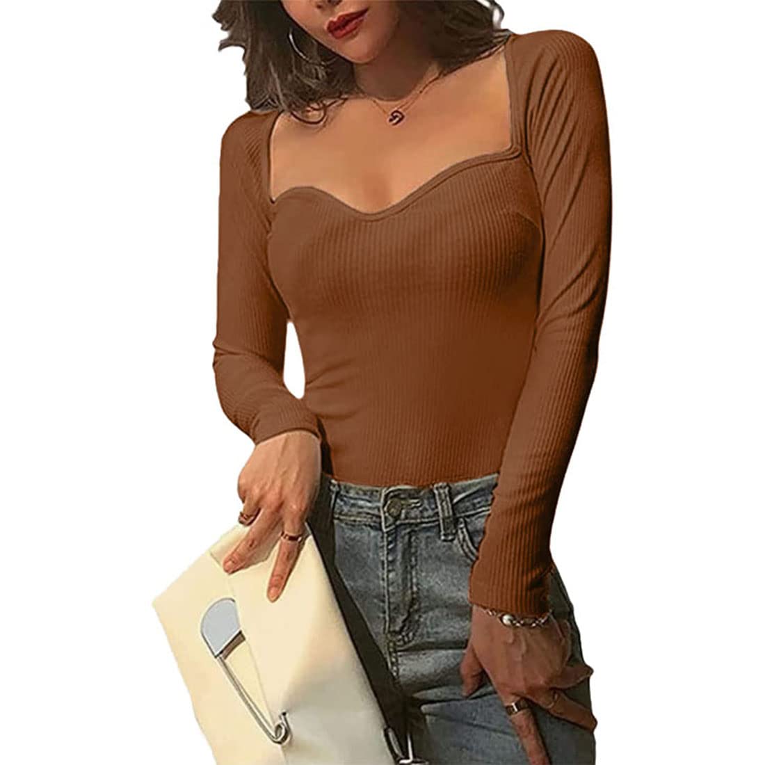 Sweetheart Neck Regular Fit Full Sleeve Casual Stylish Ribbed Tops for Women