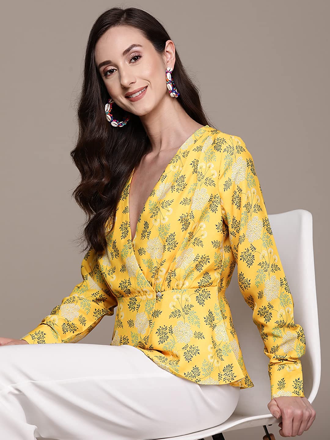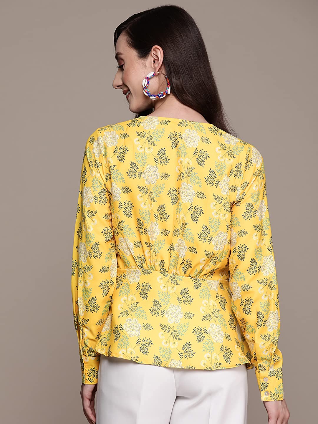 Women's Yellow Printed Wrap Top