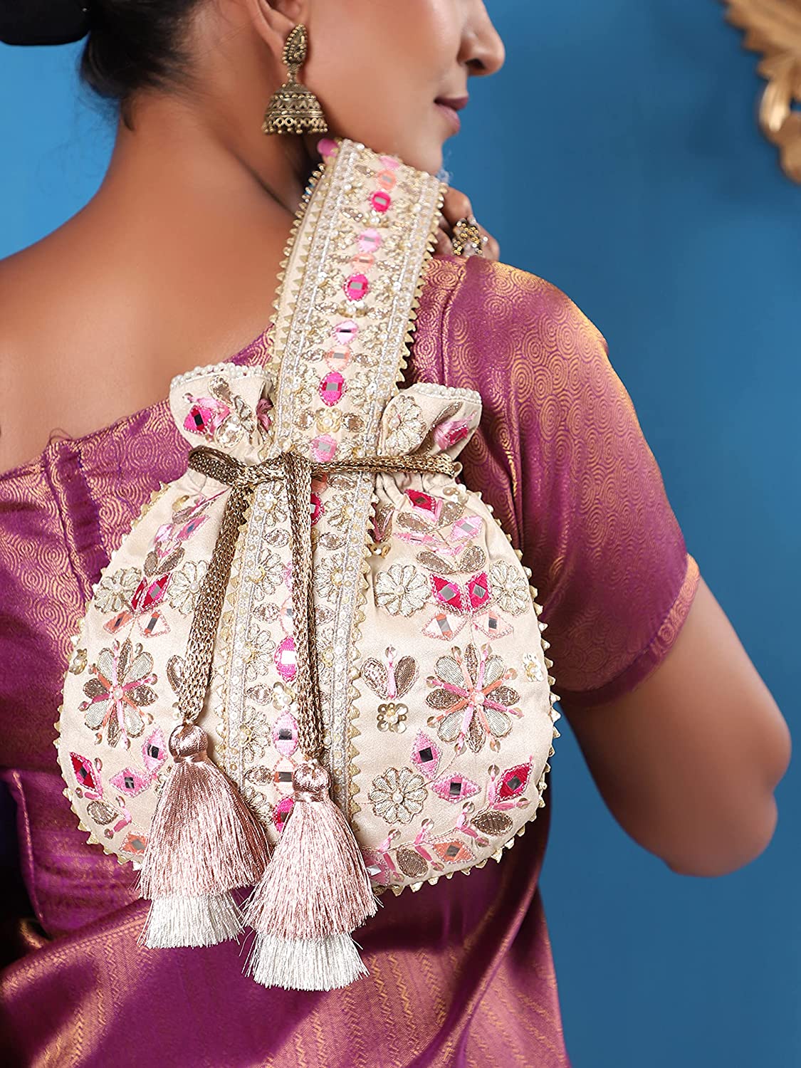 - PACKAGE INCLUDES: 1 Premium Embroidered Crepe Silk Potli Bag, 1 Protective Bag.