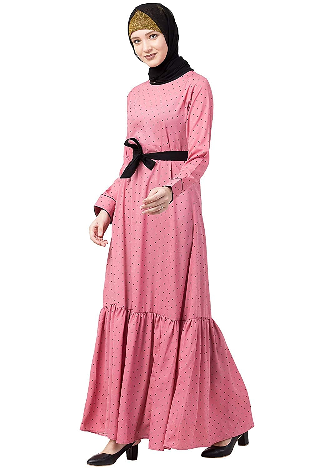 Women’s Polka Dotted Frilled Abaya Dress Made in American Crepe fabric With a Belt, Long Sleeves & Side Pocket for Ladies and Girls (BT-FAB-003-PUCE PINK)