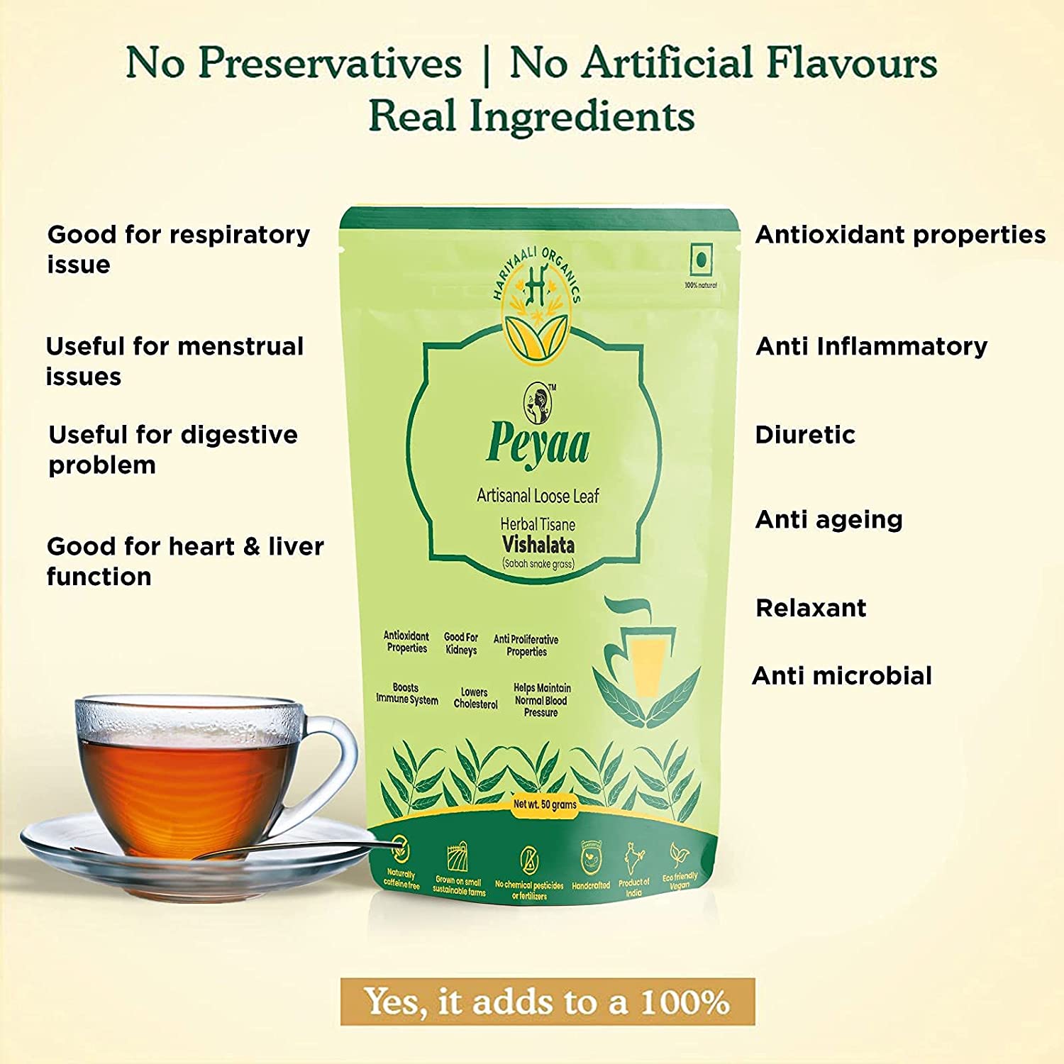 • Anti oxidant Diuretic, Herbal Tea contains Artisanal Loose leaf , Vishalata leaves a good amount of antioxidants, beneficial plant compounds that may also help defend your body against microbes.