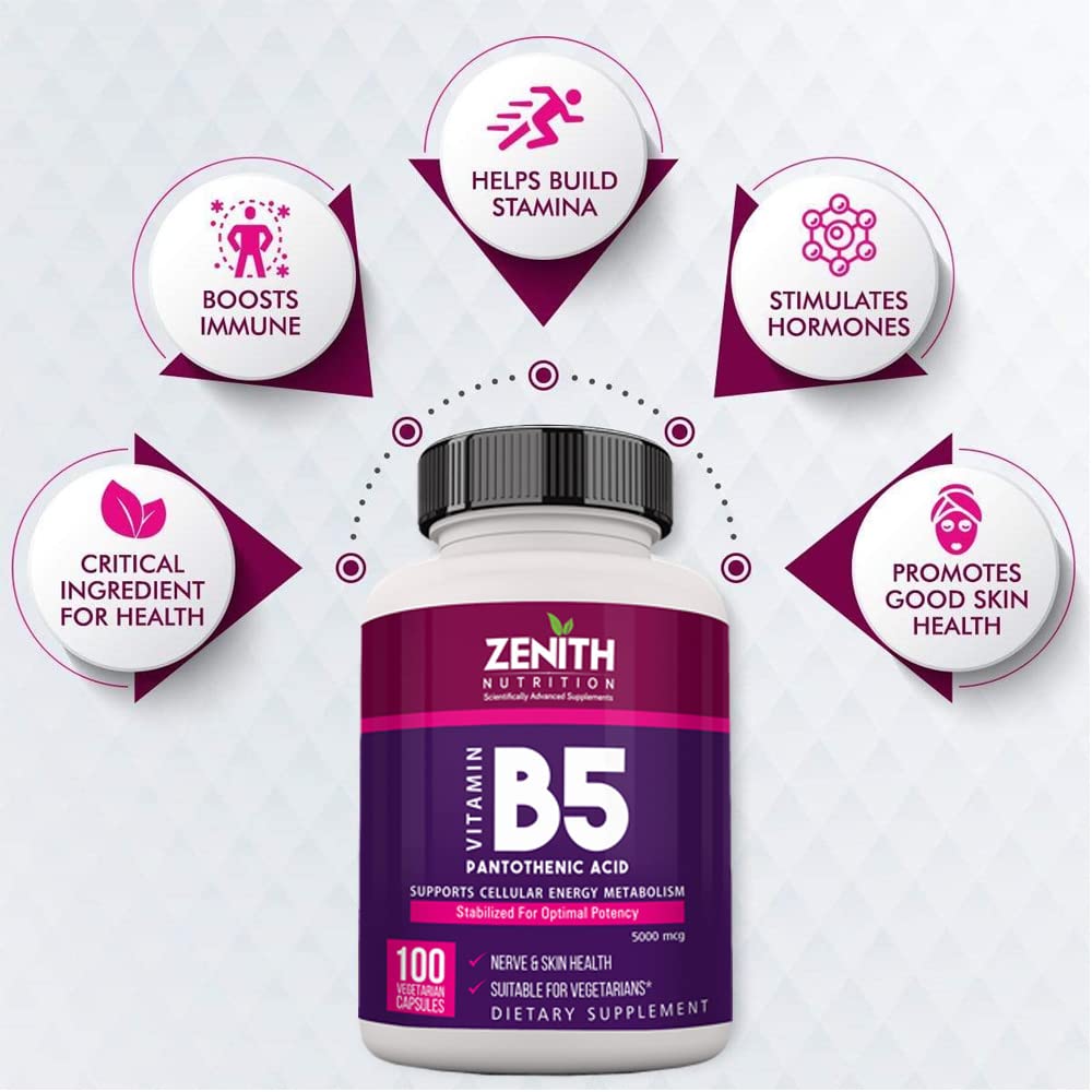 • Zenith Nutrition Pantothenic Acid (Vitamin B5) 5000mcg, Energy & Metabolism - 100 Veg capsules