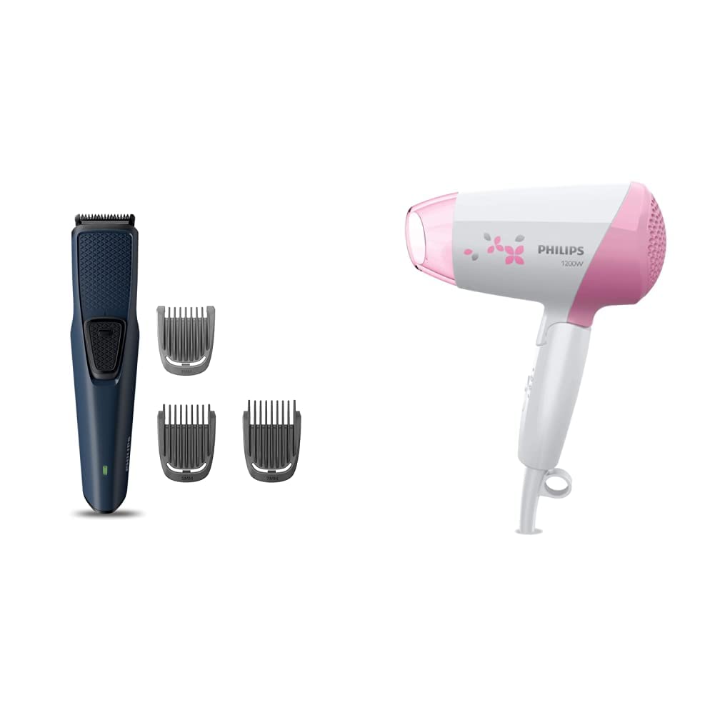 PHILIPS BT1232/15 Skin-friendly Beard Trimmer, Cordless Rechargeable with USB Charging, Charging Indicator, Travel Lock, No Oil Needed, Blue & Hair Dryer (Hp8120/00) (Pink_free Size)