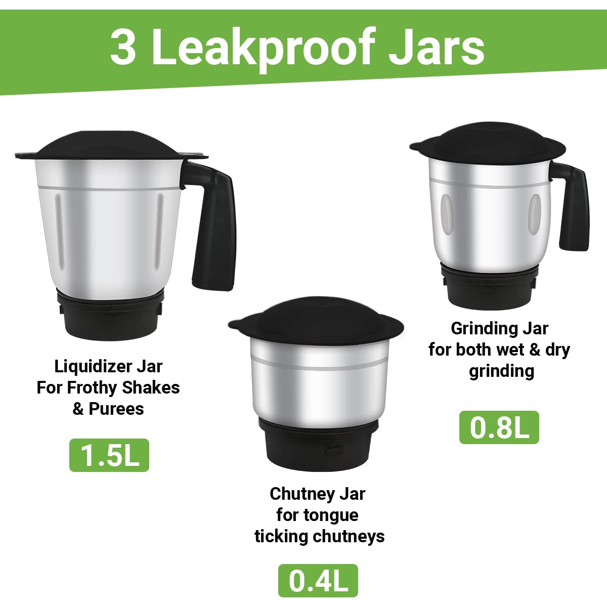 • UNIQUELY DESIGNED BLADES & MULTI-PURPOSE JARS: MaxxBlend blades are specially designed to enable uniform and powerful grinding. They are durable & are made of high-grade Stainless Steel. This mixer grinder comes with 1.5L SS Liquidizer Jar, 0.8 SS Multi-Purpose Jar & 0.4L SS Chutney Jar