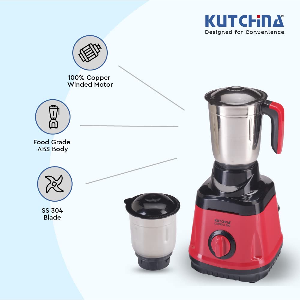 Kutchina mixer grinder 500+ watt mixer grinder with 500 watt 3 jars (Liquidizing, Wet Grinding and Chutney Jar), Stainless Steel blades, 1 Year Warranty (Grindo 500)