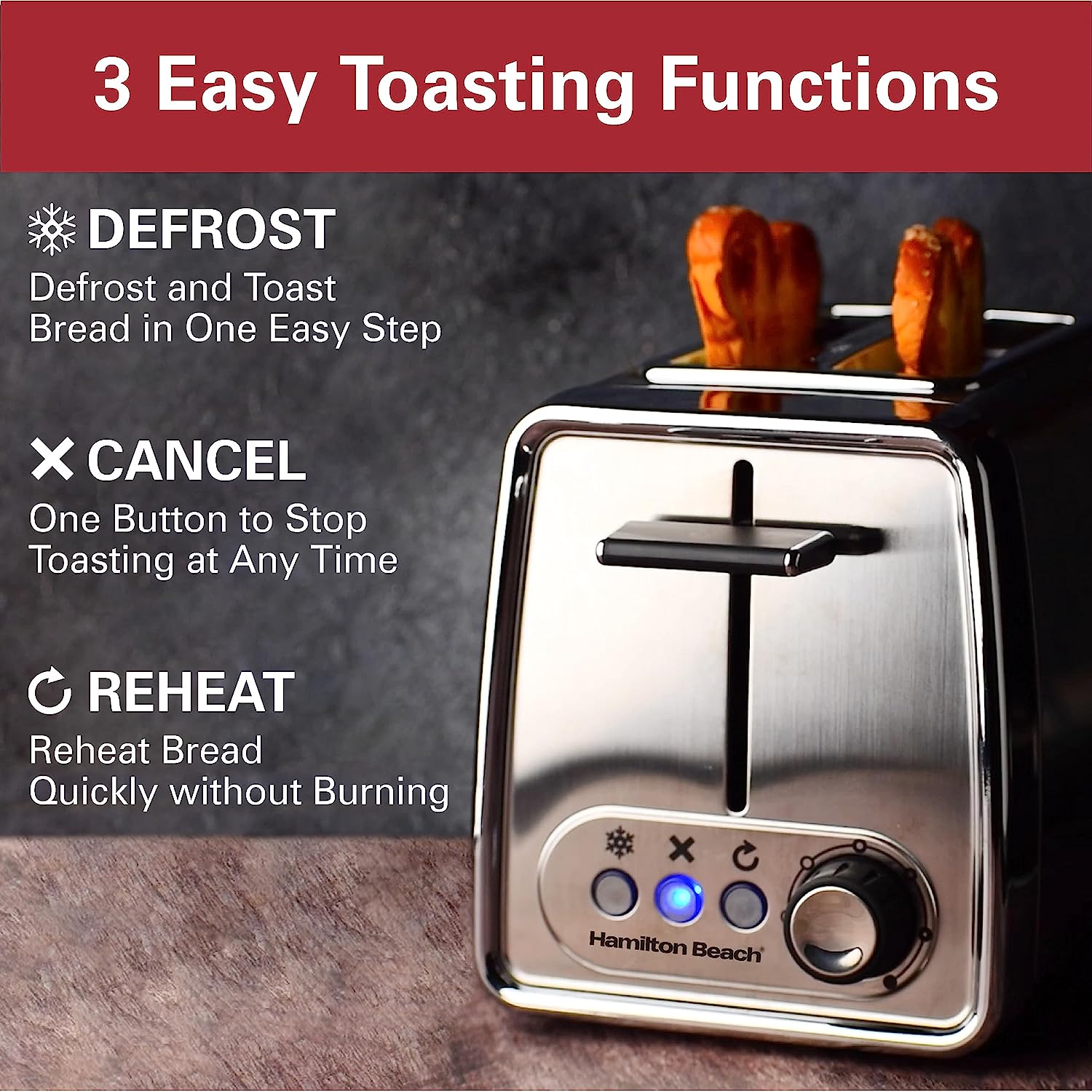 • 3 toasting functions: defrost, reheat and cancel