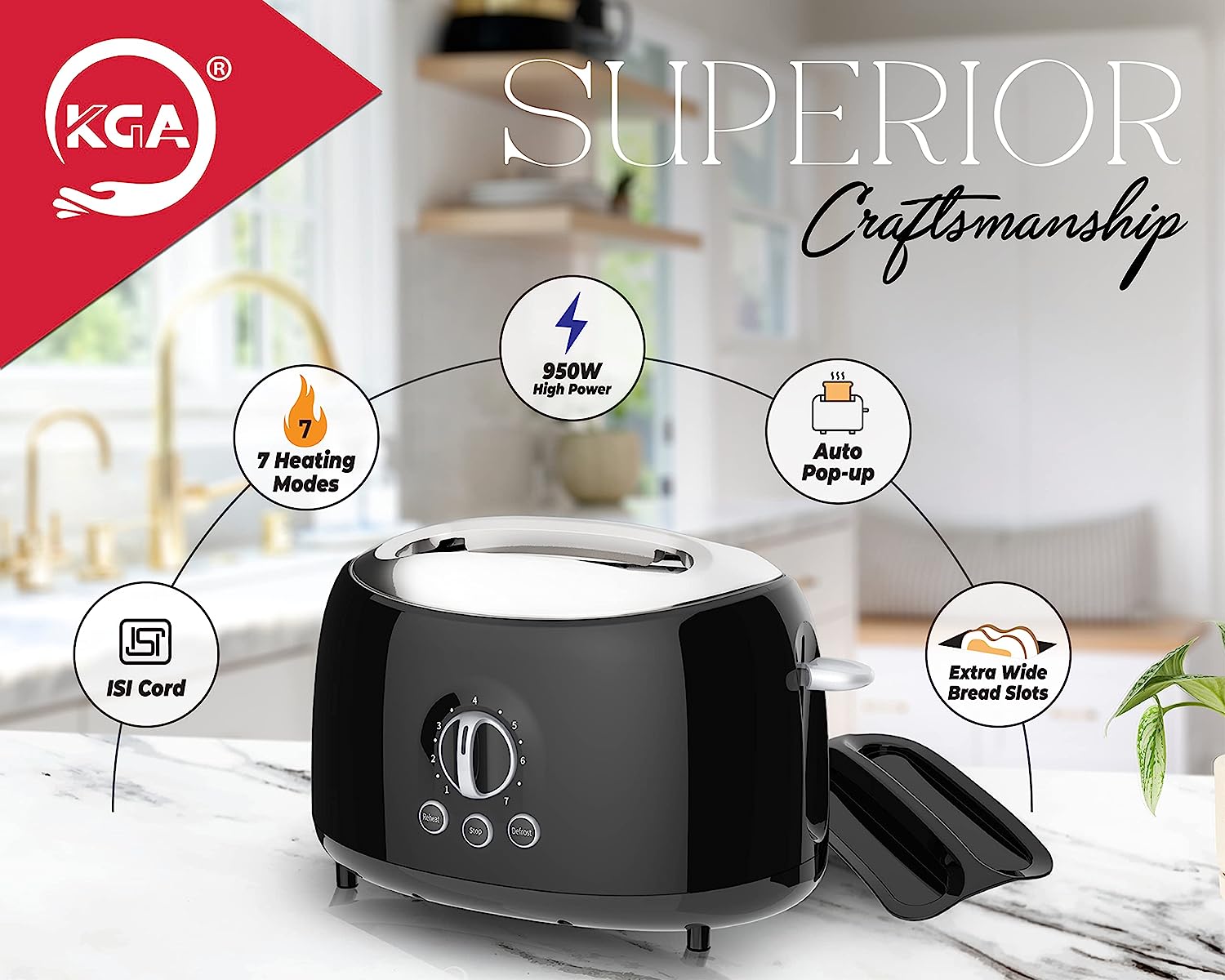 • KGA Luxury Black toastar 950W, 2-slice pop up toaster with dust cover & cool touch gloss finish ABS body.