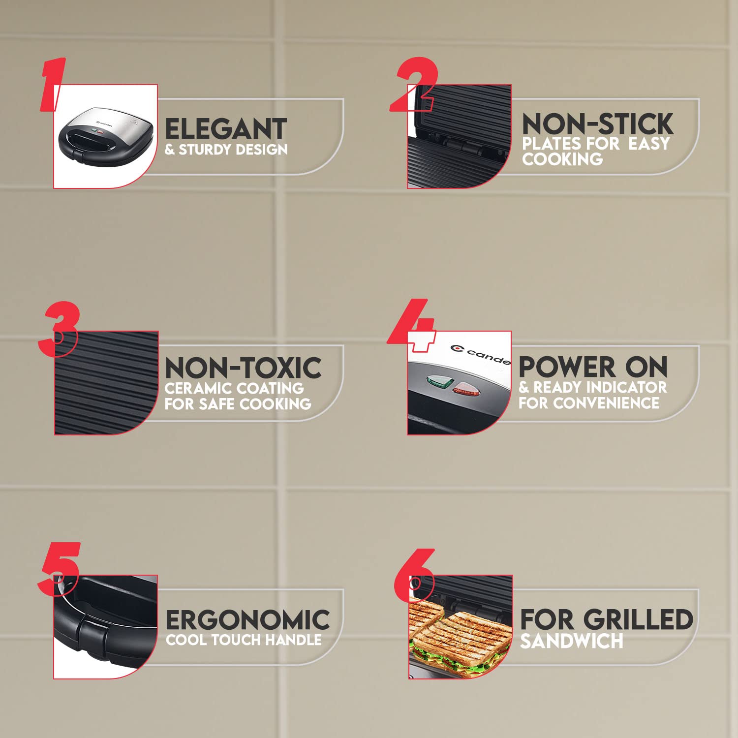 • Elegant black finish body; Non-stick plates provide a healthy low fat sandwich