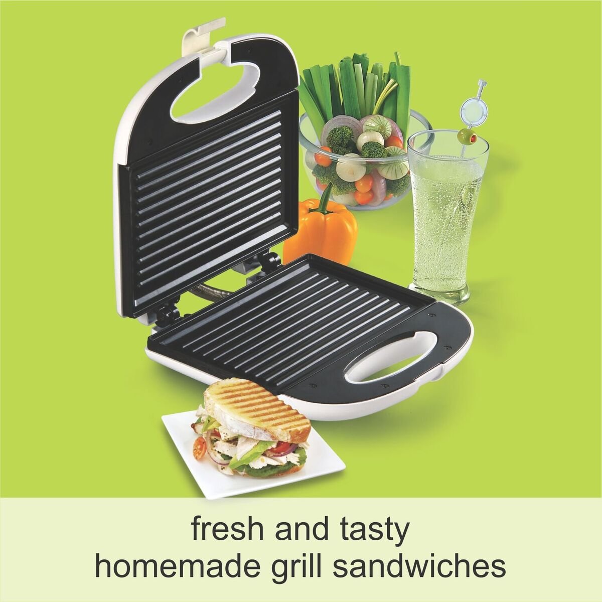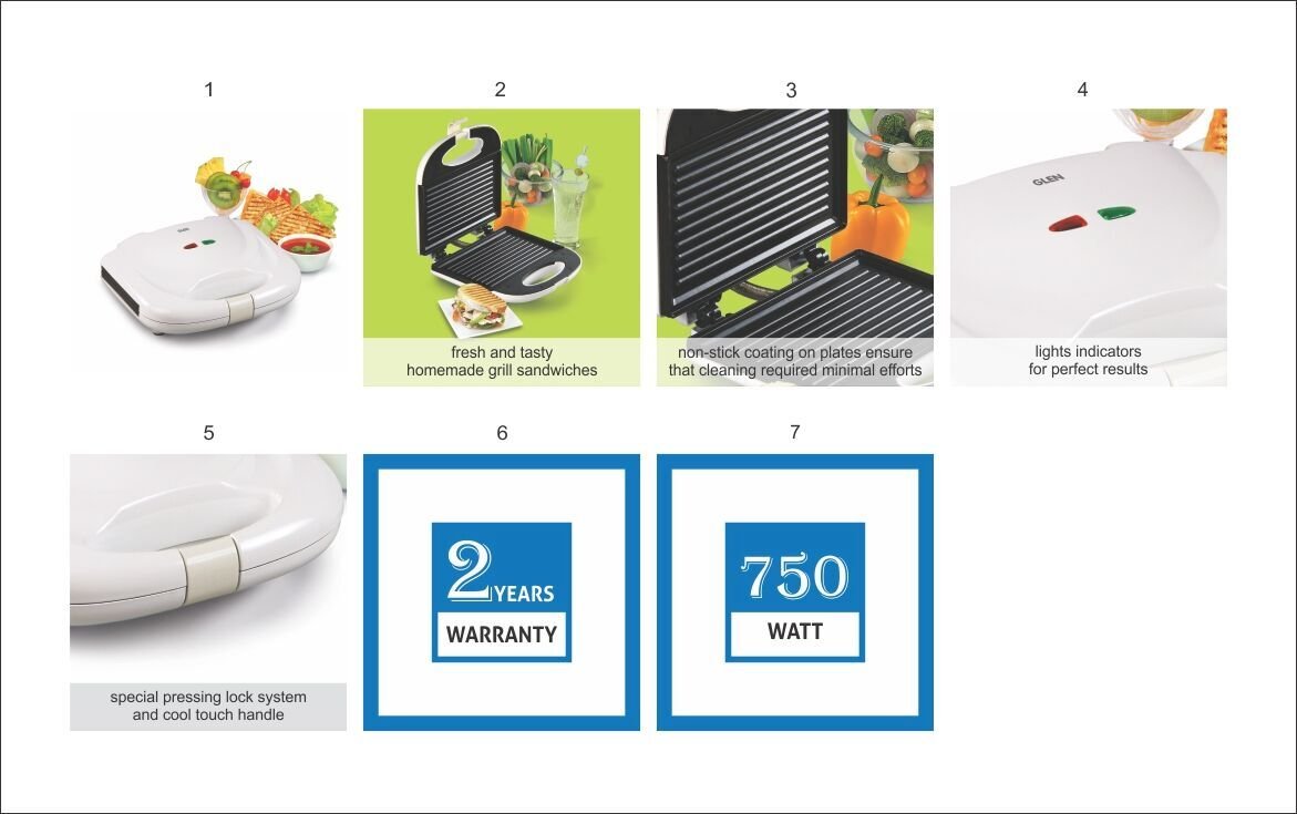 • Special Feature: Cool touch handle, light indicators; Power 750 Grill Sandwich maker; Pressing lock system; Non-stick plates; Vertical stacking; Thermostat control for even cooking