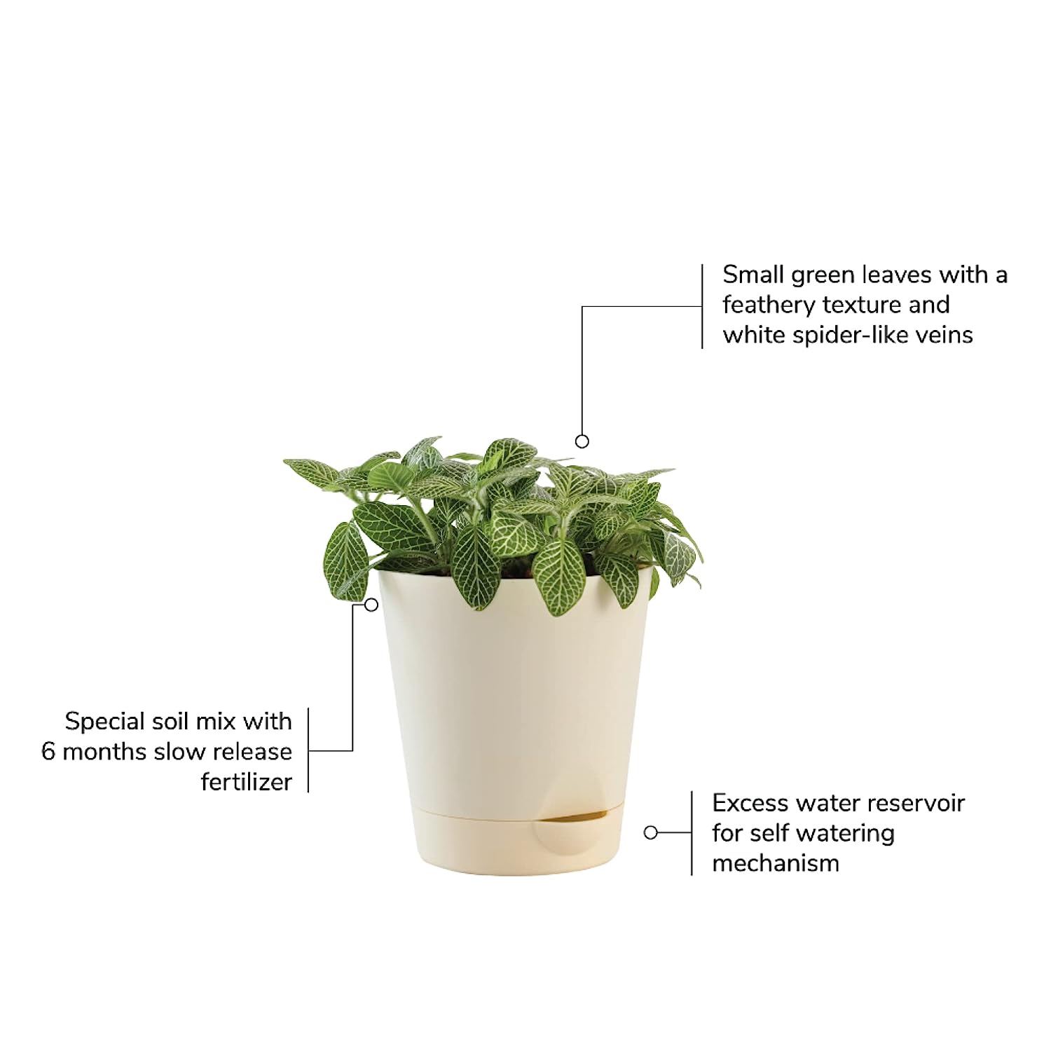 • Fittonia (Nerve plant) is a spreading evergreen with delicately veined, deep-green leaves. The foliage is low growing and trailing with oval-shaped leaves on rooting mat forming stems. Fittonia, is an eye-catching houseplant that is popular for use in hanging baskets, container gardens, and terrariums.