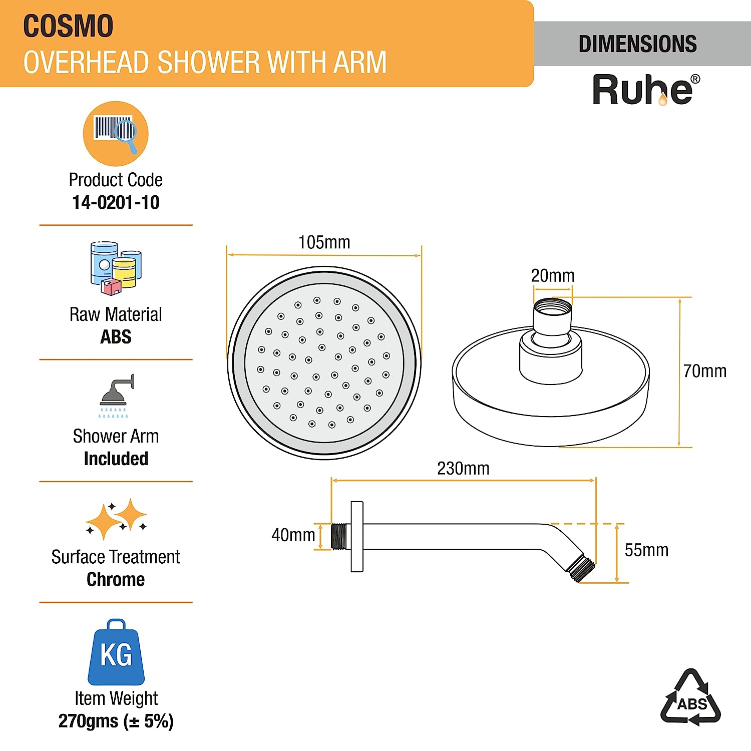 Ruhe® Cosmo ABS Overhead Shower | 4 Inches | Rainshower with 9 Inches Shower Arm and Wall Flange | Chrome Finish