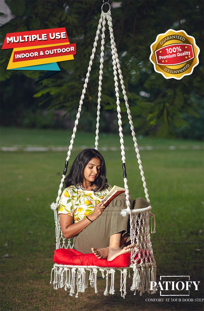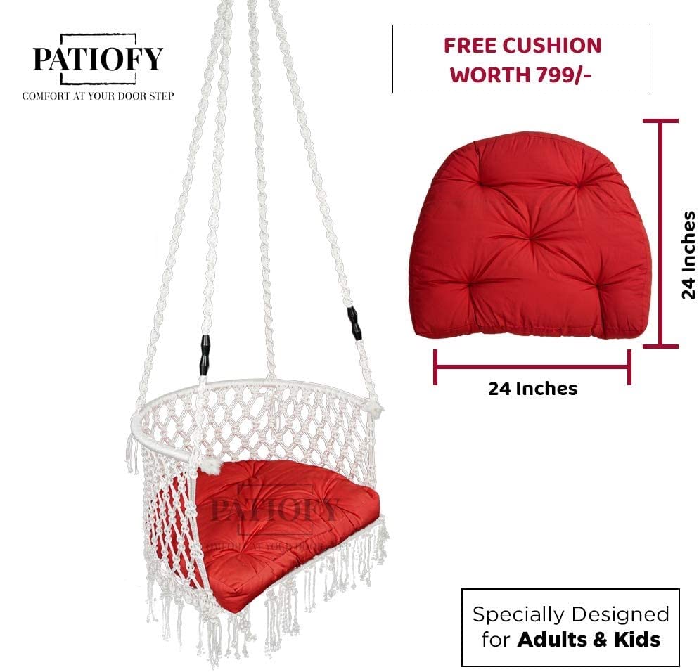 • SWING CHAIR PRODUCT SPECIFICATIONS: Built with strong and durable cotton rope with extra thickness for maximum stability and comfort, the entire swing measures at Length: 33", Breadth: 33", Full Height: 63", Sitting Depth: 17", Cushion Length: 34" and Breadth: 16", Weight-bearing capacity 200 Kgs, Color: White Swing with Red Cushion, Swing Shape: C- Shape.