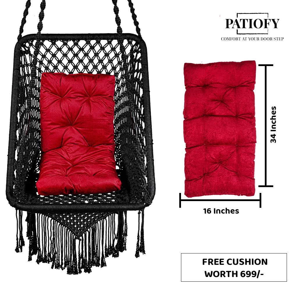 • PRODUCT SPECIFICATIONS: Built with strong and durable cotton rope with extra thickness for maximum stability and comfort, the entire swing measures at Length: 33", Breadth: 26", Full Height: 66", Sitting Depth: 17", Cushion Length: 34" and Breadth: 16", Weight-bearing capacity 150 Kgs, Color: Black Swing with Red Cushion, Swing Shape: Square.