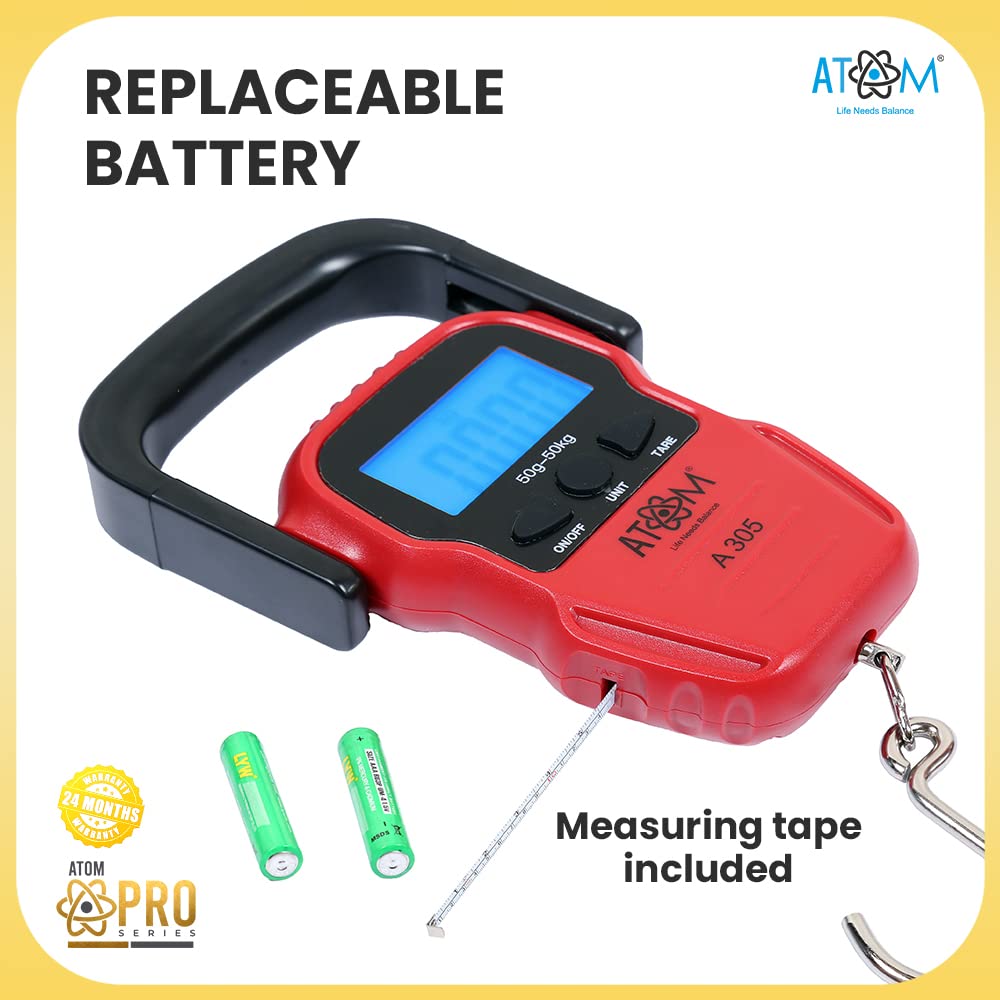 Atom A 305 hanging weight machine-easy to hold wide soft handle 50 kg extra strap and pouch included portable digital weighing scale for gas cylinder luggage suitcase and bag for flight and travel