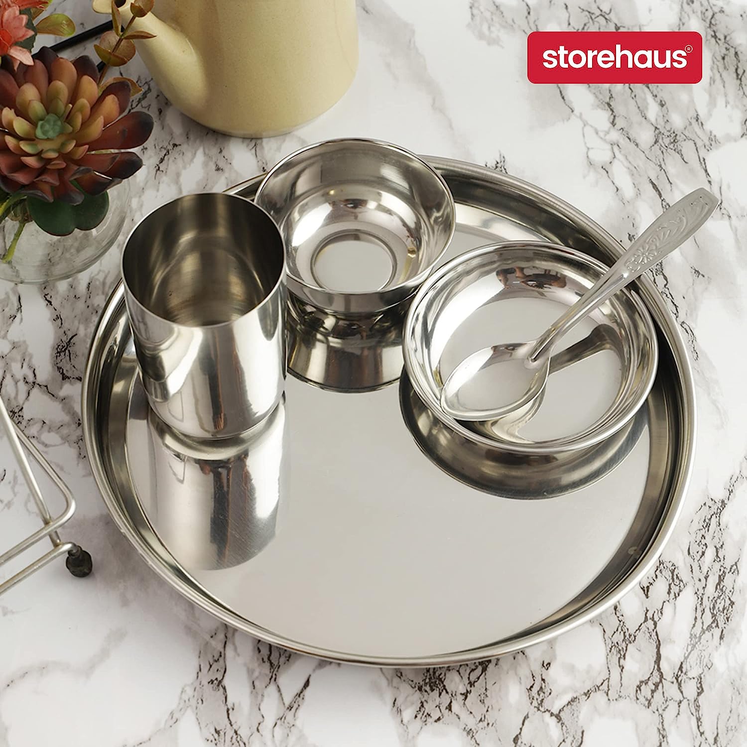 • Package Includes : 1 Thali+2 Katori+1glass+1 spoon+1 Halwa plate