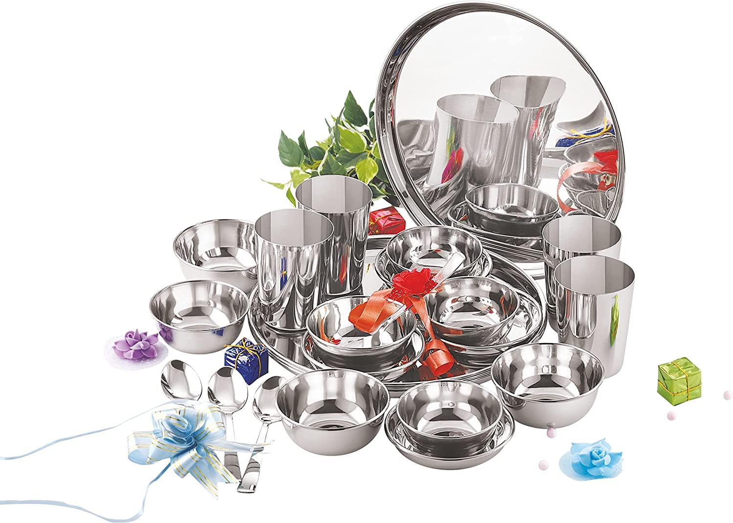 • Package Content : Stainless Steel 4 Dinner Thali, 4 Plate, 4 Small Bowl, 4 Glass, 4 Spoon & 4 Big Bowl