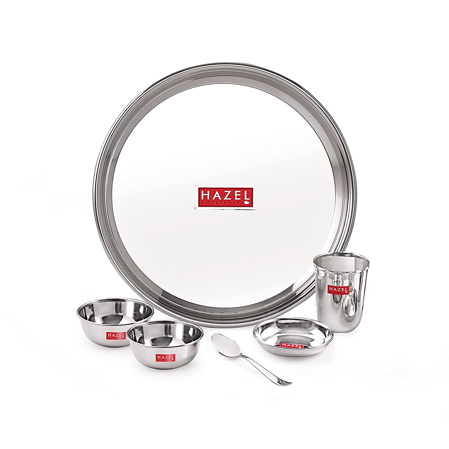 Stainless Steel Dinner Set of 6 | Dinner Set Steel (1 Steel Plate, 1 Steel Glass, 2 Bowl, 1 Dessert Plate, 1 Spoon) 6 Pieces, Silver