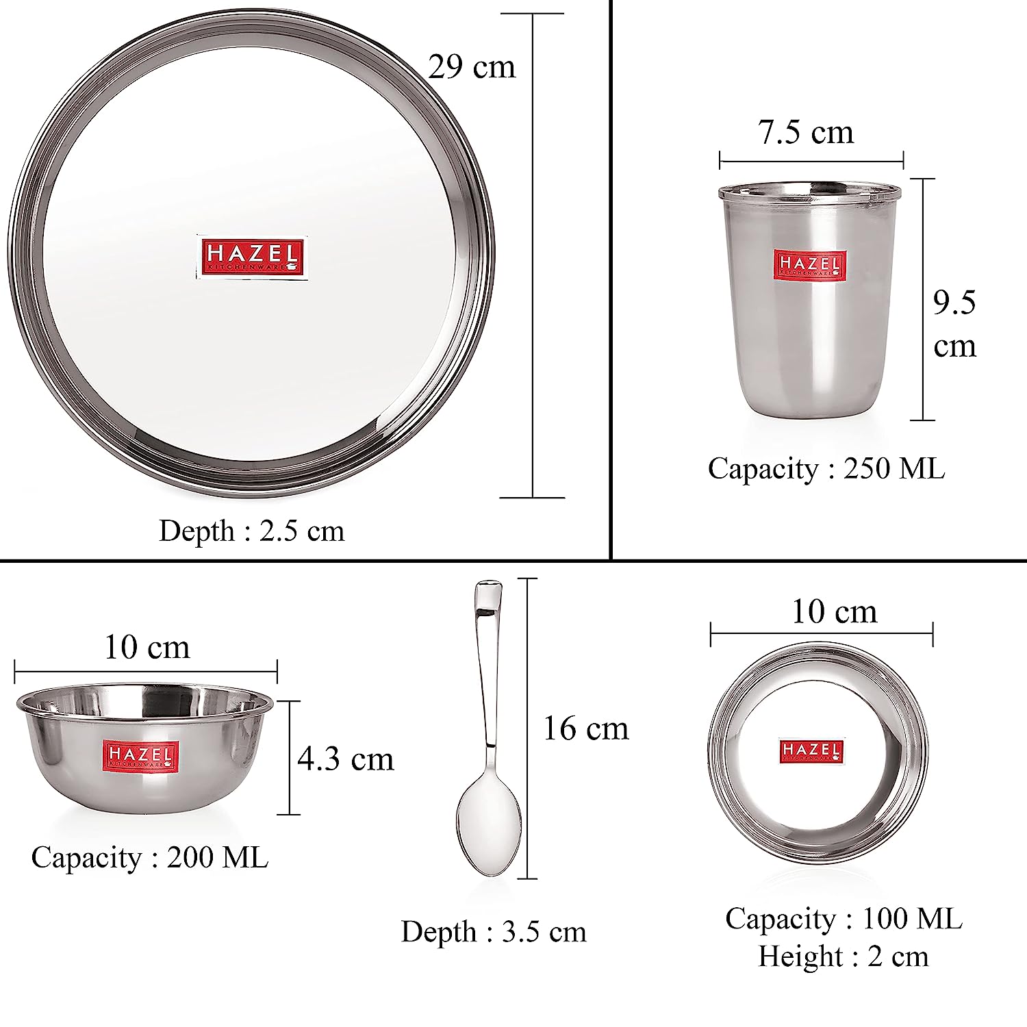 • Khumcha (Thali) Dimension : 29 x 29 x 2.5 cm (LxBxH), Weight : 450 Gram. Wati Dimension : 10 x 10 x 4.3 cm (LxBxH), Weight : 50 Gram, Capacity : 200 ML. Wati Dimension : 10 x 10 x 4.3 cm (LxBxH), Weight : 50 Gram, Capacity : 200 ML. Sweet Plate Dimension : 10 x 10 x 2 cm (LxBxH), Weight : 40 Gram, Capacity : 100 ML. Glass Dimension : 7.5 x 7.5 x 9.5 cm (LxBxH), Weight : 60 Gram, Capacity : 250 ML. Spoon Dimension : 16 x 3.5 x 2 cm (LxBxH), Weight : 30 Gram.