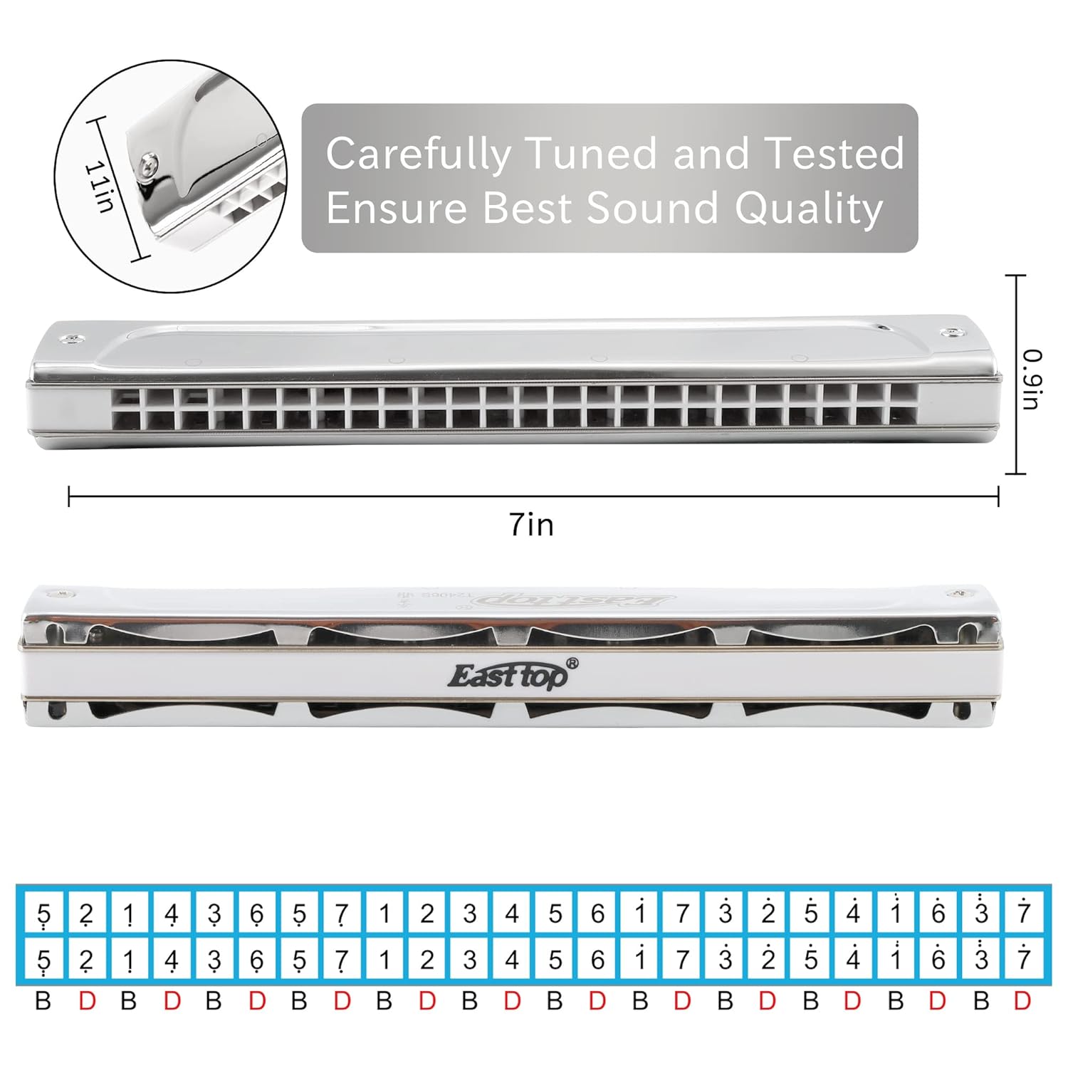 • Package includes 1x harmonica ; 1x instruction and 1x cleaning cloth. We are the harmonica manufacturer of the East top brand.Backed Up with East top 30 Days Unconditional Money Back . You can rest assured to buy our products.
