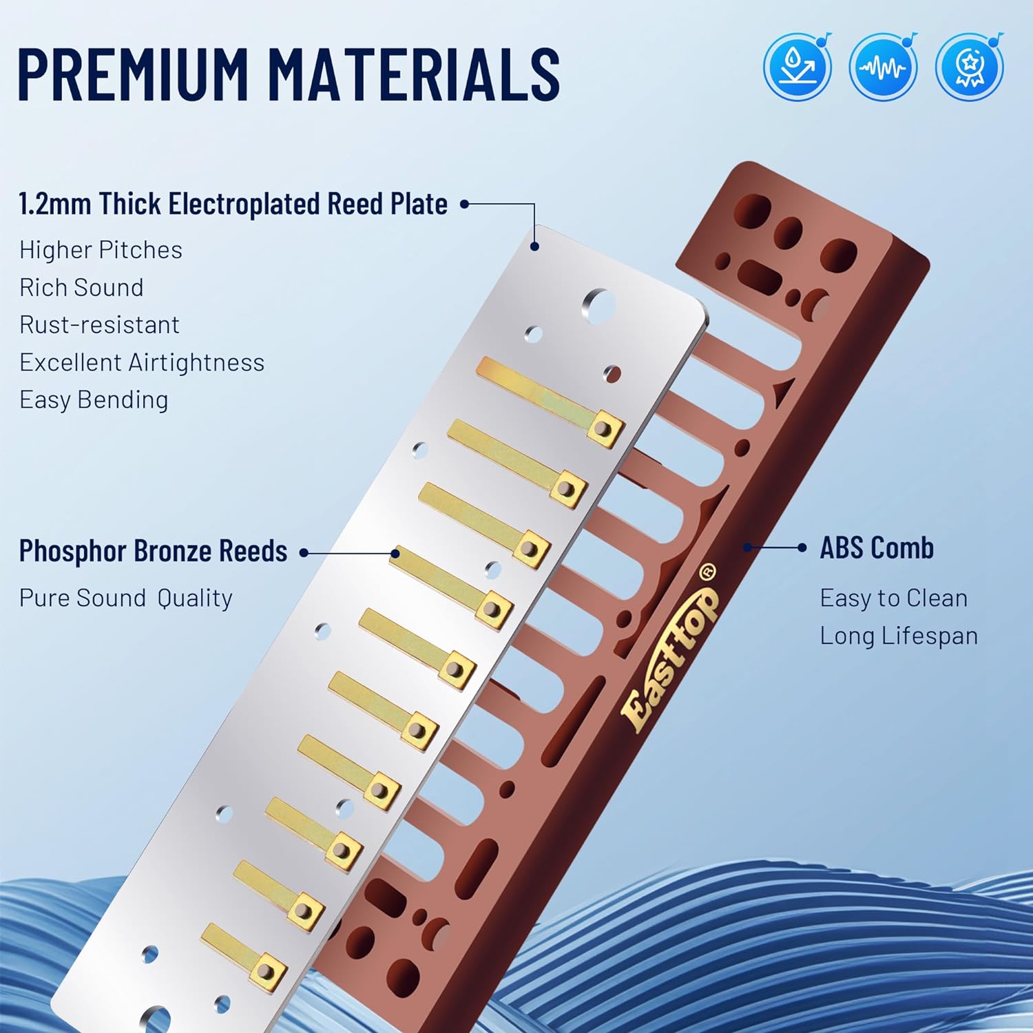 East top Mouth Organ Harmonica Key of C, 10 Holes Diatonic Blues Harp Harmonica for Adults, Beginners and Professionals with Blue Case