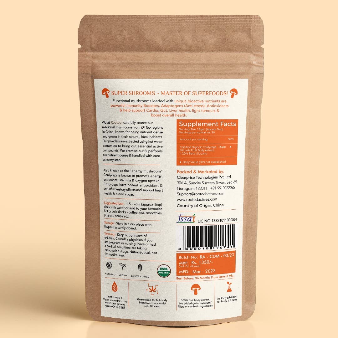 Rooted Actives Cordyceps Mushroom Extract powder (45 g) |Energy, Stamina & Endurance | Supports Testosterone, Virility, Lung health, USDA Organic, 20?ta Glucans