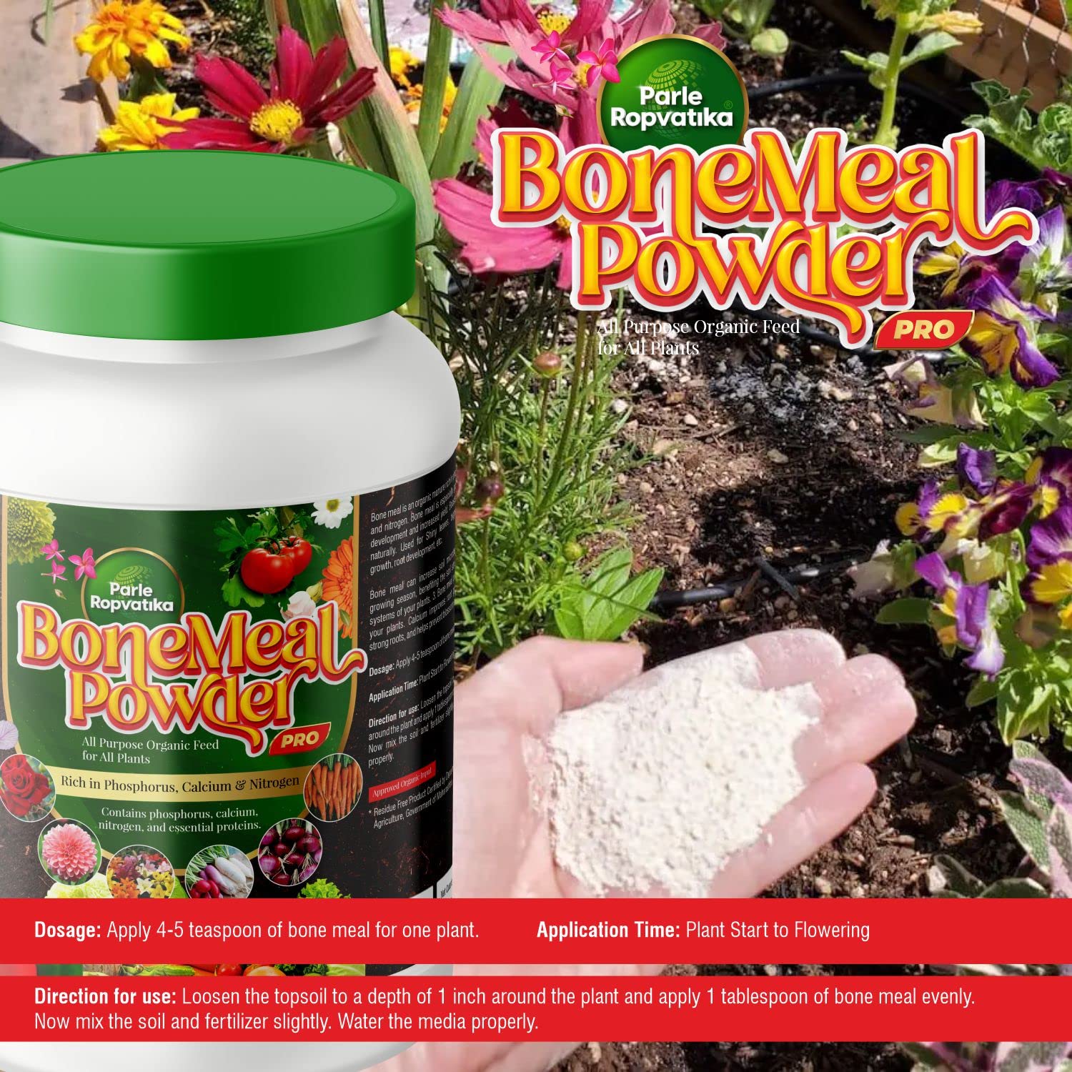 - Dosage: Apply 4-5 teaspoon of bone meal for one plant Application Time: Plant Start to Flowering Method of application: - Loosen the potting media around the plants (2-3 inch depth). - Apply 4-5 teaspoon of bone meal for grow bags and 1 fistful for planter box. - Mix thoroughly with potting media. - Level the potting mix properly. - Watering should be done immediately after nutrient application (based on moisture content)