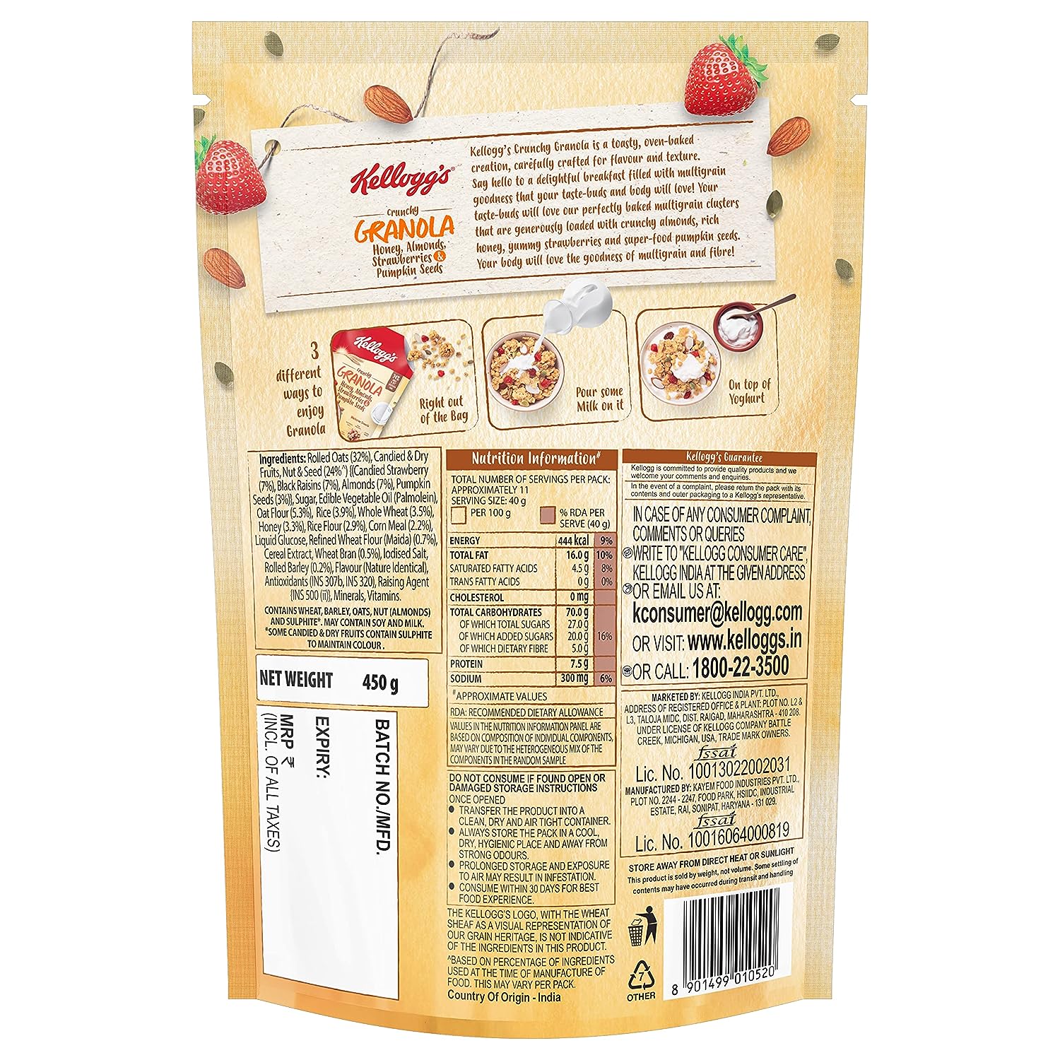 Kellogg's crunchy granola is a toasty, oven-baked creation, carefully crafted for flavour and texture. Say hello to a delightful breakfast filled with multigrain goodness that your taste-buds and body will love. Your taste-buds will love our perfectly baked multigrain clusters that are generously loaded with crunchy almonds, rich honey, yummy strawberries and super-food pumpkin seeds. Your body will love the goodness of multigrain and fibre.