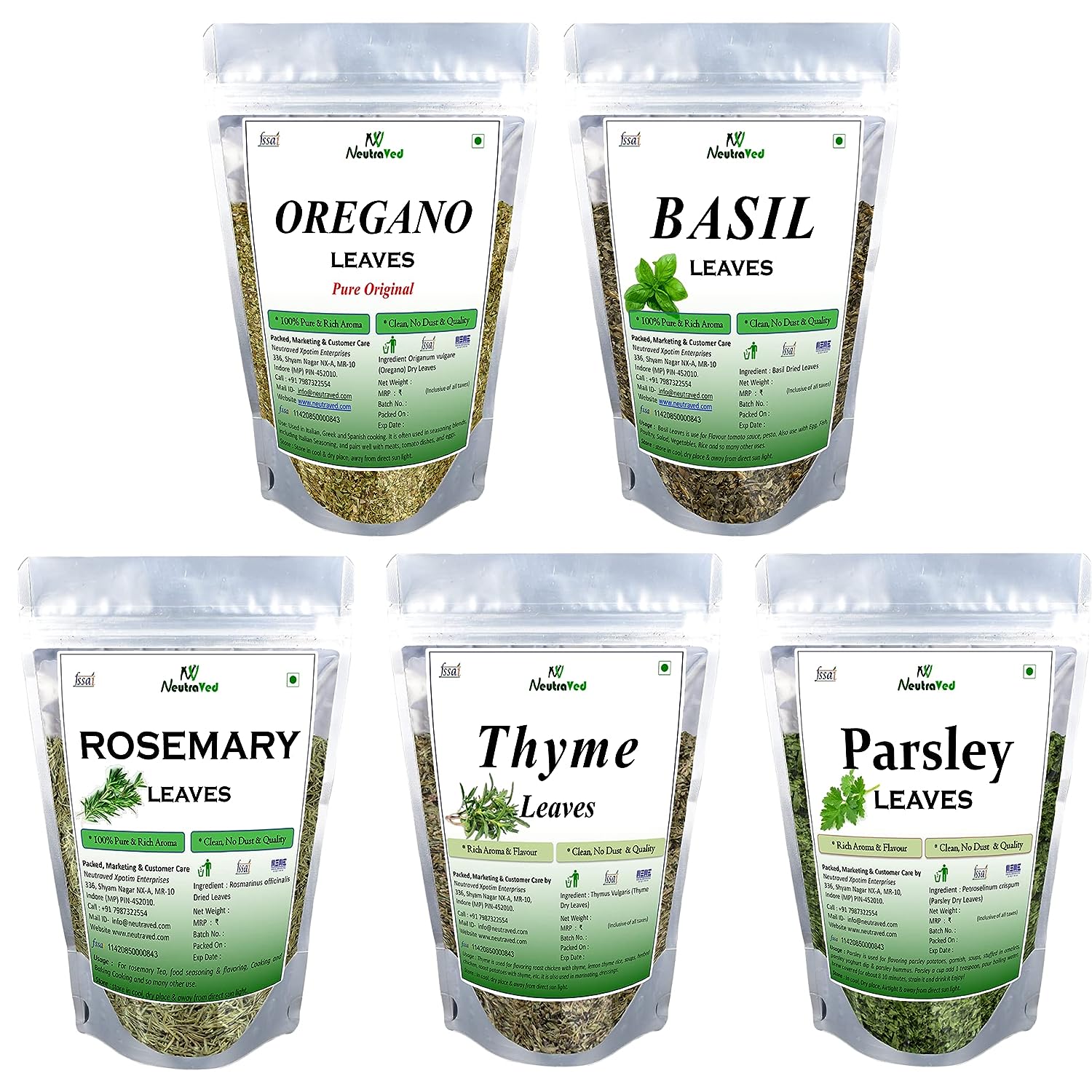 - Thyme-Leaves 40g, Basil-Leaves 35g, Parsley-Leaves 30g, Oregano 35g and Rosemary Leaves 50g.