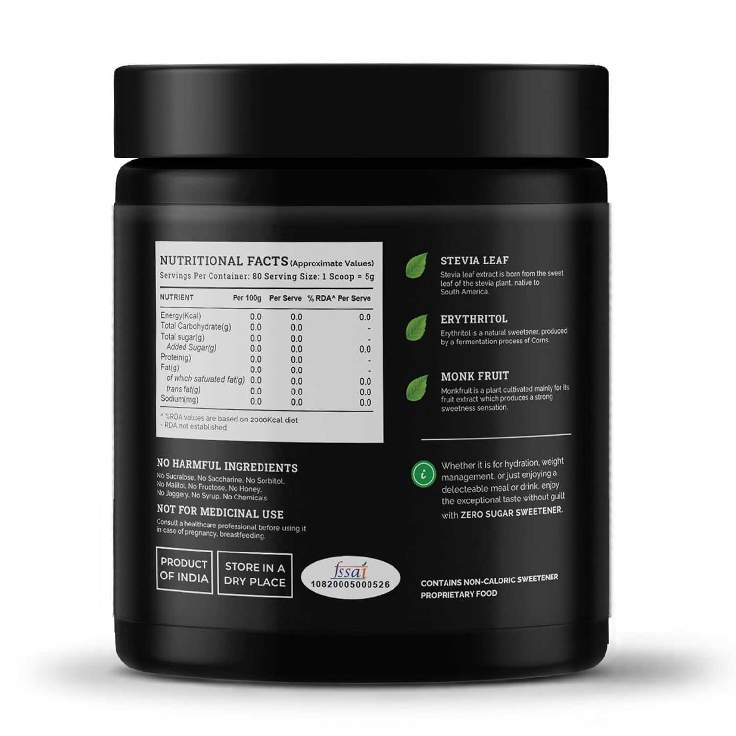 - No Empty Calories, Only Unlimited Happiness: Zero Sugar is made with zero calorie ingredients. Also, being an ultra low-GI natural sugar substitute, it may not lead to a sudden blood sugar spike while helping manage weight.