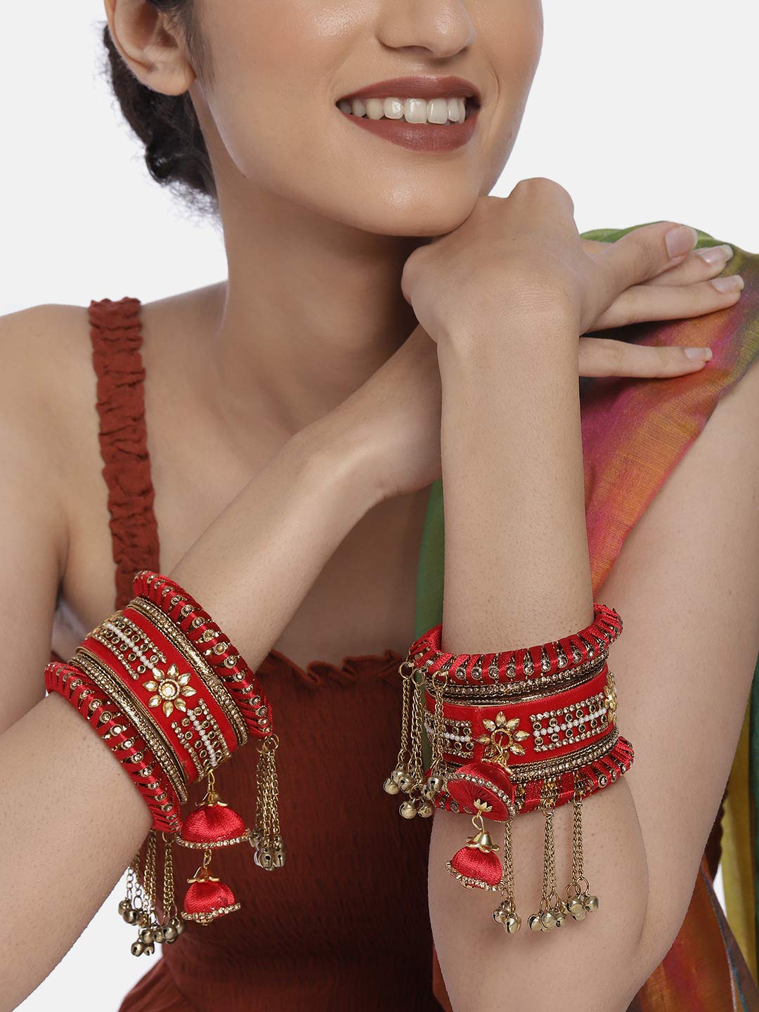 Peora Velvet Matching Kundan Floral Silk Thread Chura Bangle Set for Women (2.6 inch) (Red)
