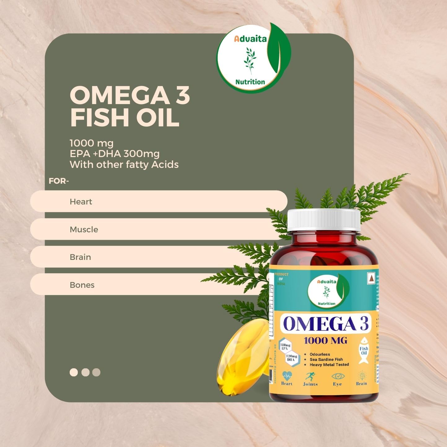 Advaita Nutrition Omega 3 Fish oil 1000mg with 180 mg EPA and 120 mg DHA for eye,heart,brain,bones & joints health (30 Softgel)