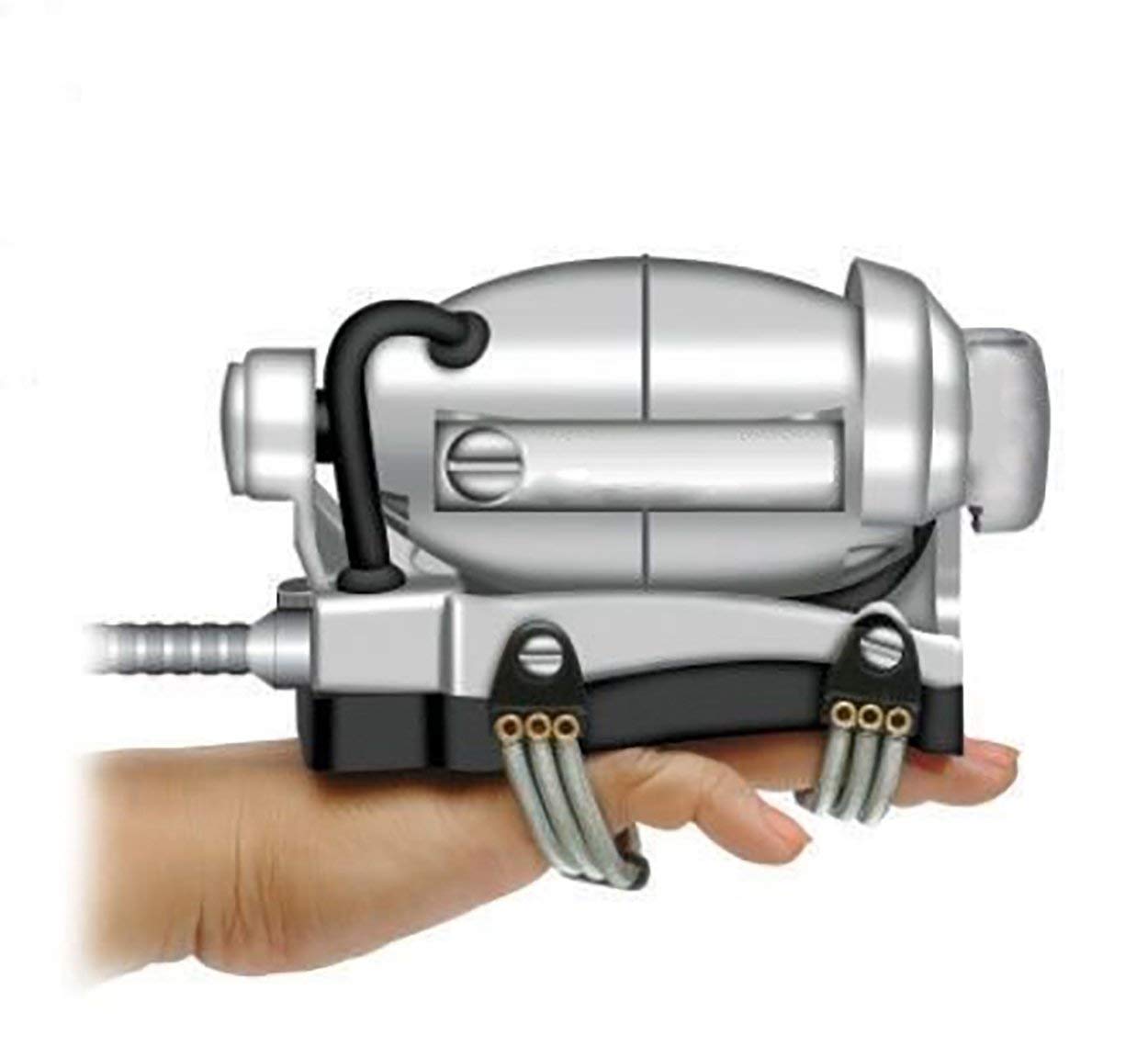 - Insert the two middle fingers only into the front spring strap. Push machine back on hand so that the fount small rubber pad is just back of the second joints of the middle fingers.