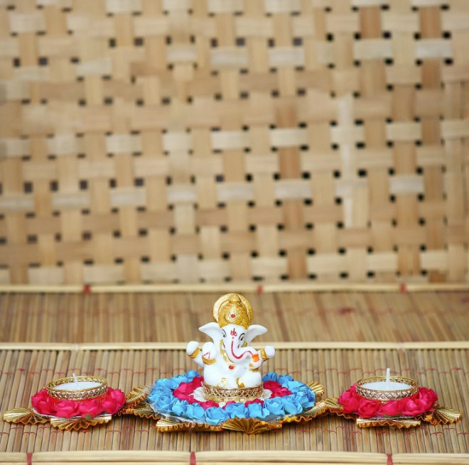 Package Content - One Lord Ganesha Idol on Decorative Plate with 2 Tea Light Holders