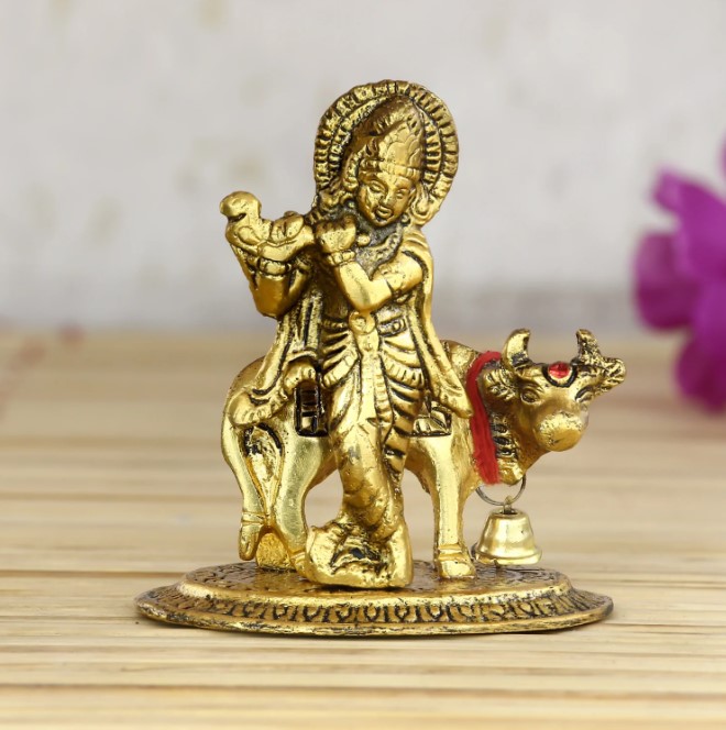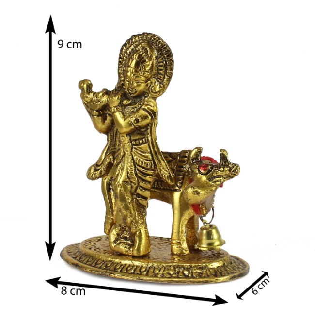 Product Description - Bring love & good vibes with golden Lord Krishna playing flute with cow showpiece that is surely going to catch everyone's eye. The intricately carved Krishna Statue made from white metal reflects the artistic brilliance and it adds elegance to your decor. Style your home and office with this white metal statue; sure to be admired by your guests. It serves as a great gift, especially around religious celebrations and festivities. This metal handicraft has been made by skilled artisans from the house of Faverdeal using various traditional techniques. You can find many more god idols and figurines in different avatars on our online portal in various colors that suit your home or office interior. The idol is of premium quality metal and has been designed beautifully.